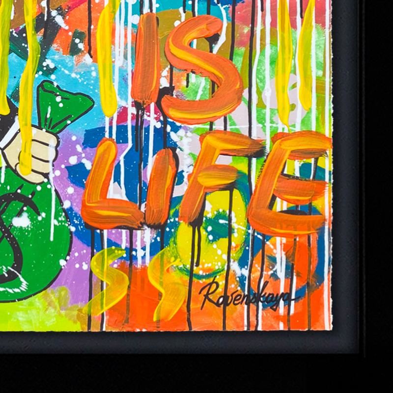 "Monopoly Money" is a one-of-a-kind mixed media on deckle edge paper by Nastya Rovenskaya, Hand signed by the artist. This piece comes floating in a custom frame. Includes Letter of Authenticity. Measures approximately 20" x 25" (framed), 16" x 21" (image).