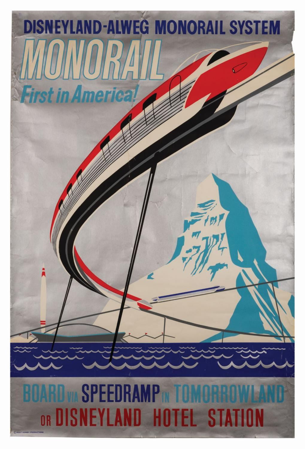 (Disneyland, 1961) A hand-silkscreened attraction poster for the Disneyland-Alweg Monorail. Designed by Paul Hartley, this poster is known for its subtle metallic grey paint that has a soft shimmer under light. Measuring 54"x36", the poster is in poor condition with heavy edge-wear, including multiple areas of heavy creasing and tearing with a 3" torn section at the upper right. There is a 25" tear running down the center of the poster. It and several smaller tears have been repaired on the reverse with tape, and there are spots of creasing throughout.