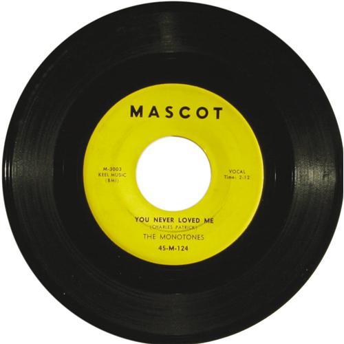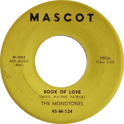 <B>Monotones "Book of Love" 45 (Mascot 3003, 1957).</B></I> What Rock and Roller doesn't get revved by the opening, "Oh, I wonder wonder who... ba-dooooh, who! Who wrote the book of love?" It's one of the all-time great Rockin' Doo-Wop tunes (if that's not a category, it should be!). This is the original small-label release from 1957. The record didn't take off until early 1958, when it got released on the larger Argo label, eventually peaking at #5 on Billboard's Hot 100. This version's quite rare. Condition: VG-EX 6. <I>From the Rockin' Rev Collection.</B></I><BR><BR><b>Shipping:</b> Recordings (<a target="_blank" href="http://www.heritageauctions.com/common/shipping.php">view shipping information</a>)