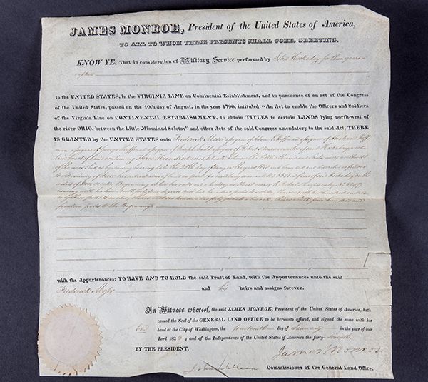 Monroe, James (1758-1831) 5th President of the United States (1817-1825). Partly-printed document signed as President, vellum, 12½ x 13½ in., Washington, 14 Jan. 1823. Granting to Frederick Moser 300 acres of land "lying north-west of the river Ohio, between the Little Miami and Sciota…." Countersigned by Land Commissioner John McLean. Intact paper seal. Overall age toning. Cancellation cuts affect McLean's signature but do not touch Monroe's.