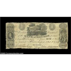 <TABLE cellSpacing=0 cellPadding=0 width="100%" bgColor=#000000 border=0><TBODY> <TR><TD width="100%"><TABLE cellSpacing=1 cellPadding=3 width="100%" border=0><TBODY><TR><TD width="100%" bgColor=#79735c><FONT face=arial color=#ffffff size=3><B>Description</B> </FONT></TD></TR><TR><TD width="100%" bgColor=#ffffff><FONT face=arial size=2><B>Monroe, MI- Bank of Monroe</B></I> $1 July 18, 1828 G2a Lee MON 2-3<BR>A very scarce early example from the first Bank of Monroe issue. <B>Fine,</B></I> with a small split at the bottom. (300-500 ) </FONT></TD></TR></TBODY></TABLE></TD></TR></TBODY></TABLE><BR><TABLE cellSpacing=0 cellPadding=0 width="100%" bgColor=#000000 border=0><TBODY><TR> Important notice: Heritage usually auctions material at the rate of 200-250 lots per hour. On some occasions eBay Live bid software or the Internet may not be able to keep up with the pace of the auction. We recommend placing a realistic absentee bid now as insurance to avoid disappointment. Occasionally the auctioneer may eliminate or reject an eBay Live bid, and the auctioneer may also reopen a lot after the close of the eBay live bidding (usually because we missed an audience bid), and may reject your bid even if it shows you as the winning bidder. By bidding via eBay Live, you agree that Heritage may award the lot to another bidder at its sole discretion under the circumstances described above or any other reasonable circumstances. Also please note that all Heritage lots purchased through eBay Live carry a 20% Buyer's Premium. Please make sure you read the Terms and Conditions before you bid.</TR></TBODY></TABLE>
