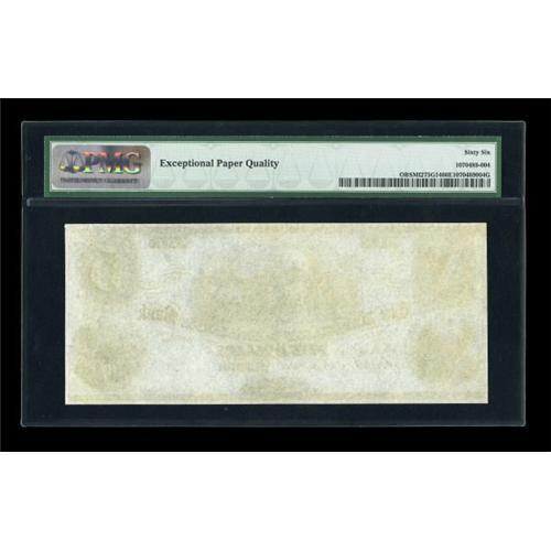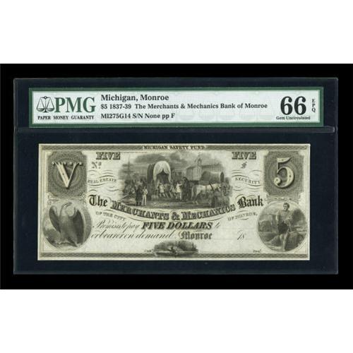 <B>Monroe, MI- The Merchants & Mechanics Bank</B></I> $5 18__ G14<BR> We have had a PMG Choice About Unc 58 $5 with the same design on this bank sell for $402 in the last six months. This beautiful remainder grades <B>PMG Gem Uncirculated 66 EPQ</B></I>.<BR><BR><b>Shipping:</b> Coins & Currency (<a target="_blank" href="http://www.heritageauctions.com/common/shipping.php">view shipping information</a>)
