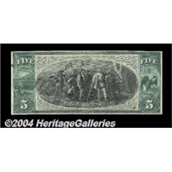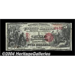 Monroeville, OH - $5 1875 Fr. 404 The First NB Ch. # 2438A lovely First Charter example from a just plain rare bank which issued First Charters and Brown Backs only before liquidating in 1906. Bright Choice Crisp Uncirculated. <BR><BR><B>Important notice:</B> Heritage usually auctions material at the rate of 200-250 lots per hour. On some occasions eBay Live bid software or the Internet may not be able to keep up with the pace of the auction. We recommend placing a realistic absentee bid now as insurance to avoid disappointment. Occasionally the auctioneer may eliminate or reject an eBay Live bid, and the auctioneer may also reopen a lot after the close of the eBay live bidding (usually because we missed an audience bid), and may reject your bid even if it shows you as the winning bidder. By bidding via eBay Live, you agree that Heritage may award the lot to another bidder at its sole discretion under the circumstances described above or any other reasonable circumstances. Since eBay bids are not shown to us until we open the lot on the floor, we treat those bids just like floor bids. In most cases the floor responds before the eBay bid is presented to us, due to Internet lag time, so for consistency we have made it a policy that floor bids are always considered first over tie eBay live bids. Also please note that all Heritage lots purchased through eBay Live carry a 20% Buyer's Premium. Please make sure you read the Terms and Conditions before you bid. <BR><BR><B>IMPORTANT ANNOUNCEMENT ABOUT RESERVES:</B> Heritage now divulges all reserves on its web site 7 days before every auction. If you want to know whether the reserve on this lot has been met, and if not, what the reserve amount is, please visit this lot page on the HeritageCoin.com web site, or email: bid@HeritageGalleries.com