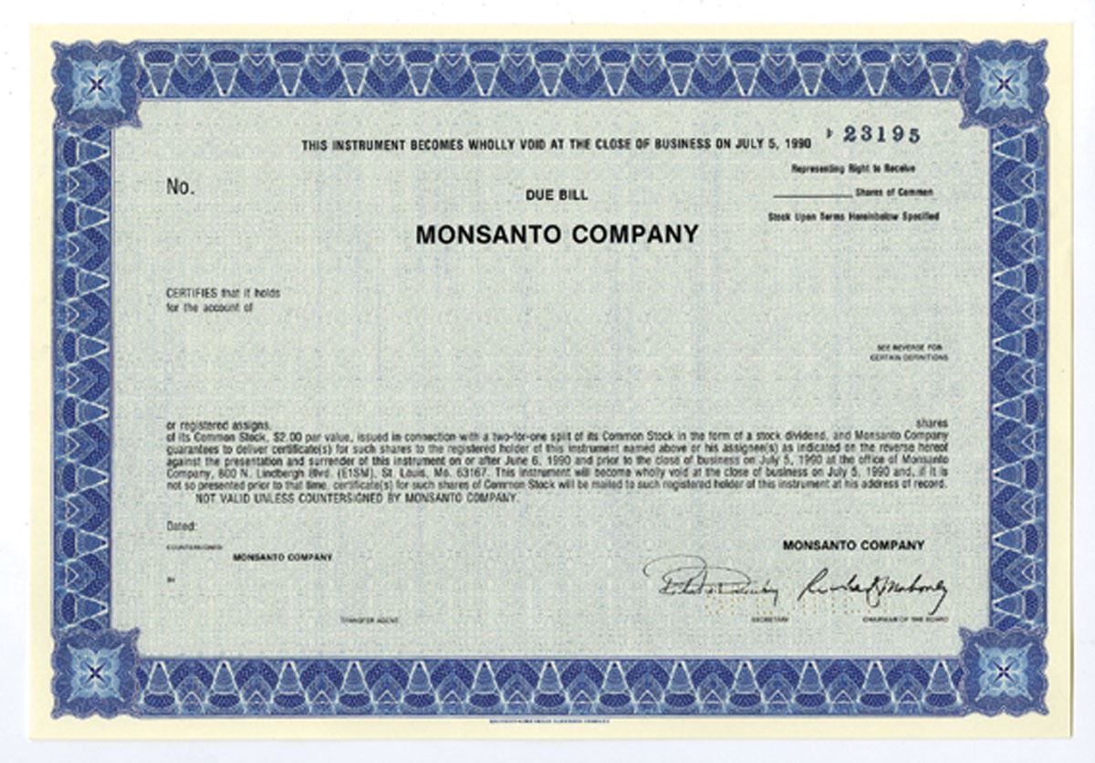 Monsanto Co., 1980s Odd Shrs Specimen Due Bill Stock Cert., VF-XF SCBN Blue. The Monsanto Company was an American agrochemical and agricultural biotechnology corporation founded in 1901. In 2018, it was acquired by Bayer as part of its crop science division. It was headquartered in Creve Coeur, Missouri. Monsanto developed Roundup, a glyphosate-based herbicide, in the 1970s, and became a major producer of genetically engineered crops.