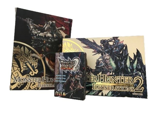 Monster Hunter & Monster Hunter 2 Illustrations books and Monster Hunter PlayStation portable gaming book in Japanese.These were used as inspiration to make the film by the production office.