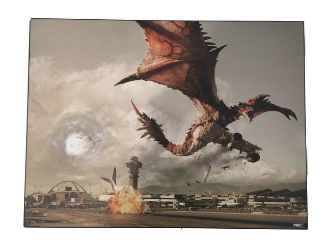 Monster Hunter spiraled notebook featuring 21 photo printed pages of artwork featuring the different monsters of the film and direct quotes about the characteristics of each. Used for pre-production as well as during production. Direct from the producer's offices (20"x11"). Comes with an oversized photo printed on a heavy plaque of the beast, Rathalos, shooting down a plane at LAX.