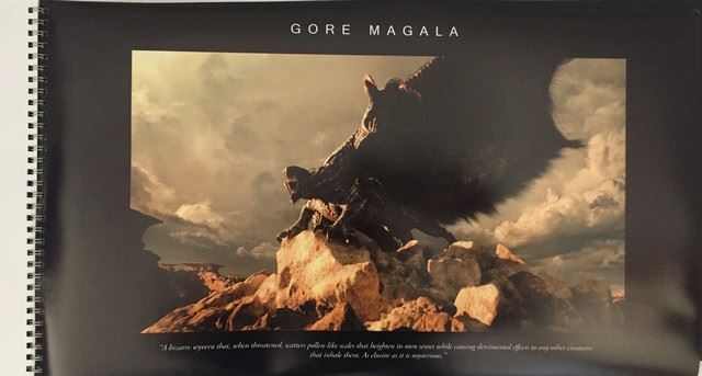 Monster Hunter spiraled notebook featuring 21 photo printed pages of artwork featuring the different monsters of the film and direct quotes about the characteristics of each. Used for pre-production as well as during production. Direct from the producer's offices (20"x11"). Comes with an oversized photo printed on a heavy plaque of the beast, Rathalos, shooting down a plane at LAX.