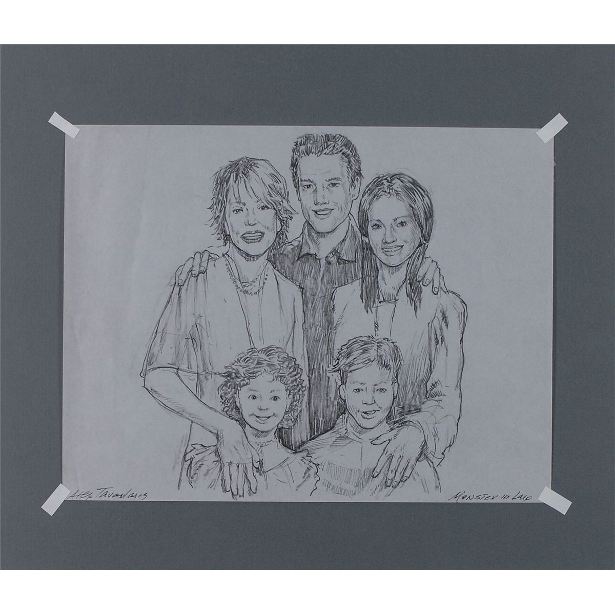 Original concept art for the 2005 film Monster-in-Law, pencil on an off-white 11 x 8.5 sheet, signed in the lower left in ink, “Alex Tavoularis.” Sketch depicts Jane Fonda, Michael Vartan, and Jennifer Lopez with their children. Affixed at corners to a 14 x 12 board. In fine condition.