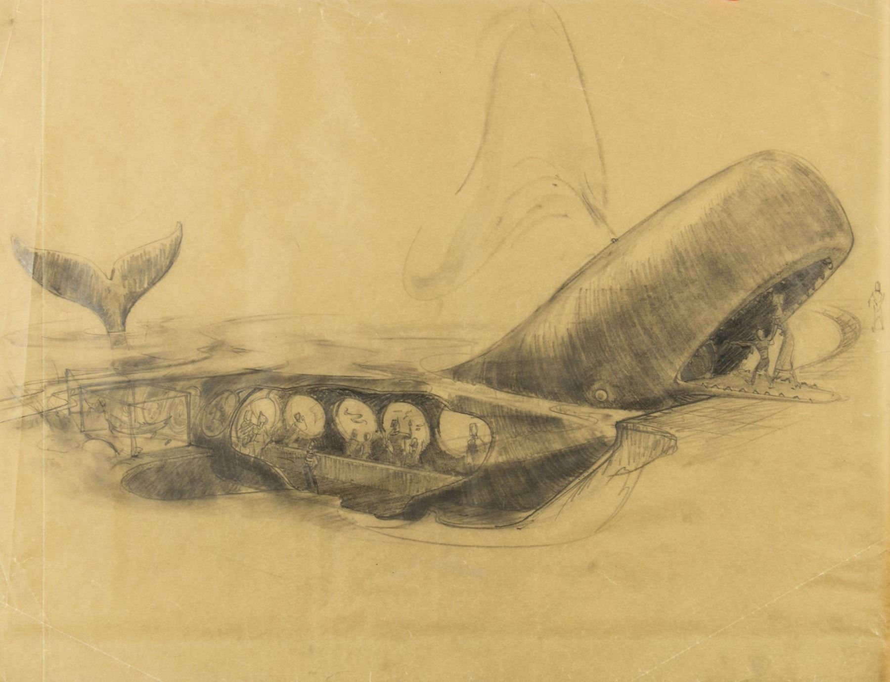 (Disneyland, c.1954) An original concept drawing by Imagineer Bruce Bushman. The concept features an unbuilt Pinocchio-themed walk-through aquarium, based on the character Monstro. This original drawing is accomplished in pencil on thin artist's paper and measures approximately 18.5"x23.5". The condition is very good with some wear and minor creasing throughout from use. A thin strip of tape is adhered to the top-edge on the reverse.
