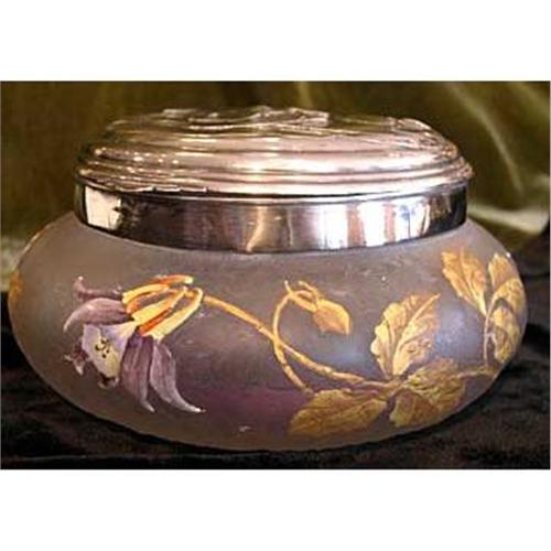 The box was made in Pantin, France, circa 1895, featuring an enameled floral motif. The box lid is marked ORIVIT with lovely flower and leaf repousse. The enamel is in excellent condition. Measurements are 3 ¼? tall, 6? diameter base, 4 ¾? diameter lid; with hinged silverplate lid.