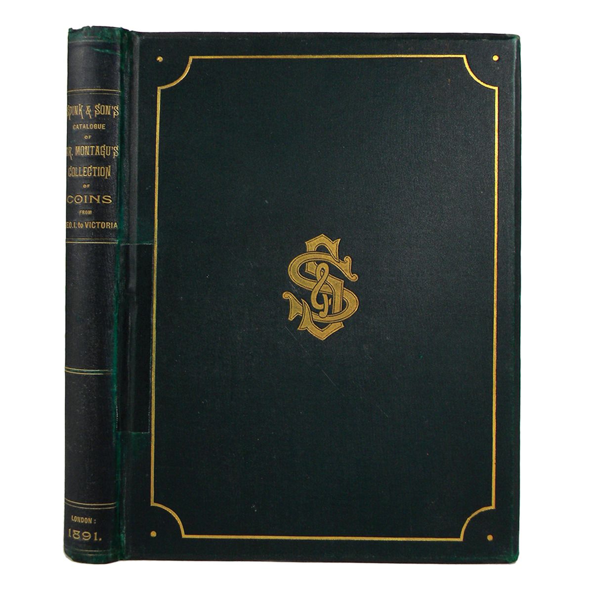 Spink & Son. CATALOGUE WITH NUMEROUS ILLUSTRATIONS OF A COLLECTION OF MILLED ENGLISH COINS, DATING FROM THE REIGN OF GEORGE I TO THAT OF HER PRESENT MAJESTY, AND INCLUDING PATTERNS AND PROOFS OF COINS OF THAT PERIOD IN GOLD, SILVER, BRONZE, &C. FORMED BY H. MONTAGU. London: Spink & Son, (1890). Crown 4to, original dark green cloth, bordered, decorated and lettered in gilt; beveled edges; all page edges gilt. (2), 174, (1) leaves, printed on rectos only; title and introduction within decorative borders; text illustrations. Cloth repair to front cover; near fine. This section of the Montagu collection was sold privately before the famous series of auction sales and is the only illustrated record of the Montagu patterns and proofs. Where known, pedigrees are also given. An important and rare private catalogue in the original deluxe binding.