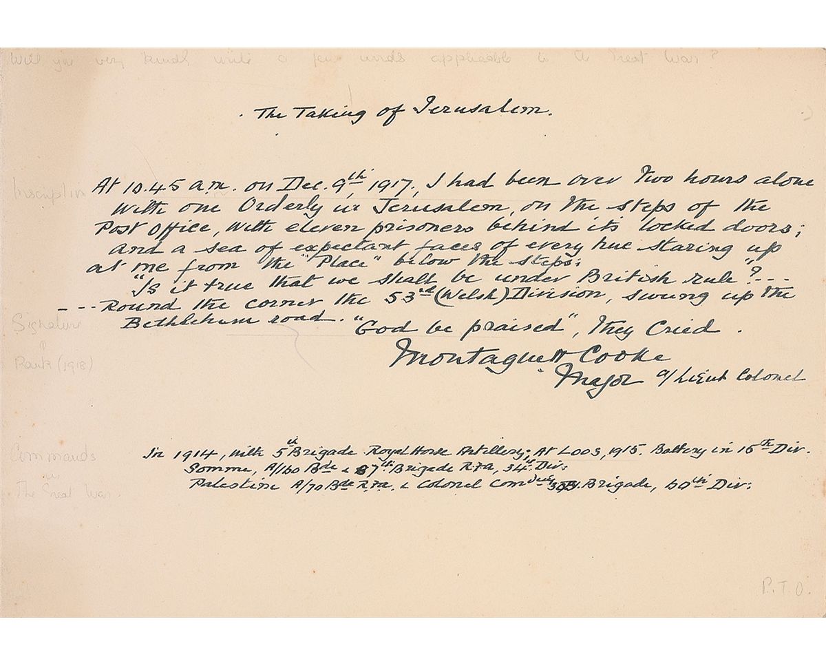 British soldier in the Royal Field Artillery during World War I who authored two books on his experiences, Clouds That Flee and With the Guns East and West. Fascinating handwritten statement, signed “Montague H. Cooke, Major/Lieut. Colonel,” one page, 10 x 7, no date. Cooke pens a statement entitled “The Taking of Jerusalem,” in full: “At 10:45 a.m. on Dec. 9th 1917, I had been over two hours alone with one orderly in Jerusalem, on the steps of the post office, with eleven prisoners behind its locked doors; and a sea of expectant faces of every hue staring up at me from the ‘Place’ below the steps: ‘Is it true that we shall be under British rule?’—Round the corner the 53rd (Welsh) Division, swung up the Bethlehem road. ‘God be praised,’ they cried.” Cooke also signed on the second adjoining page. In fine condition, with mild toning.