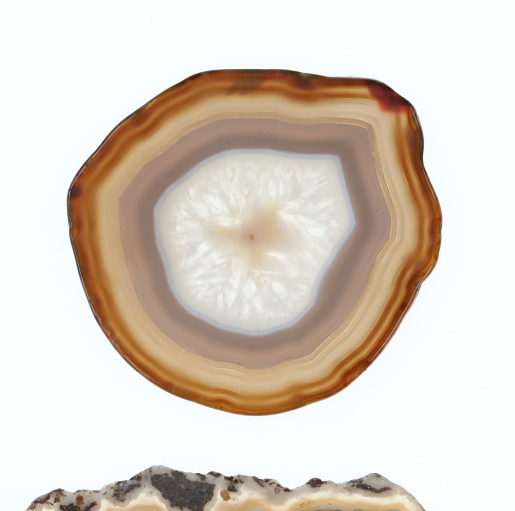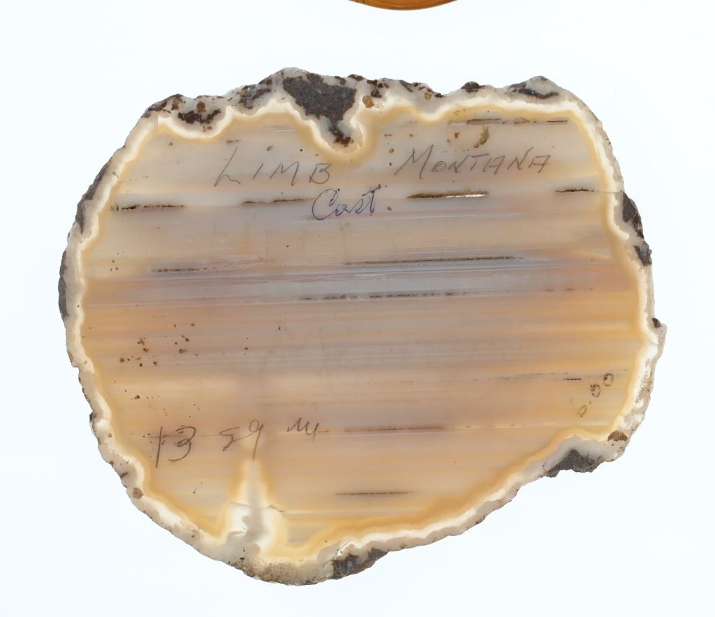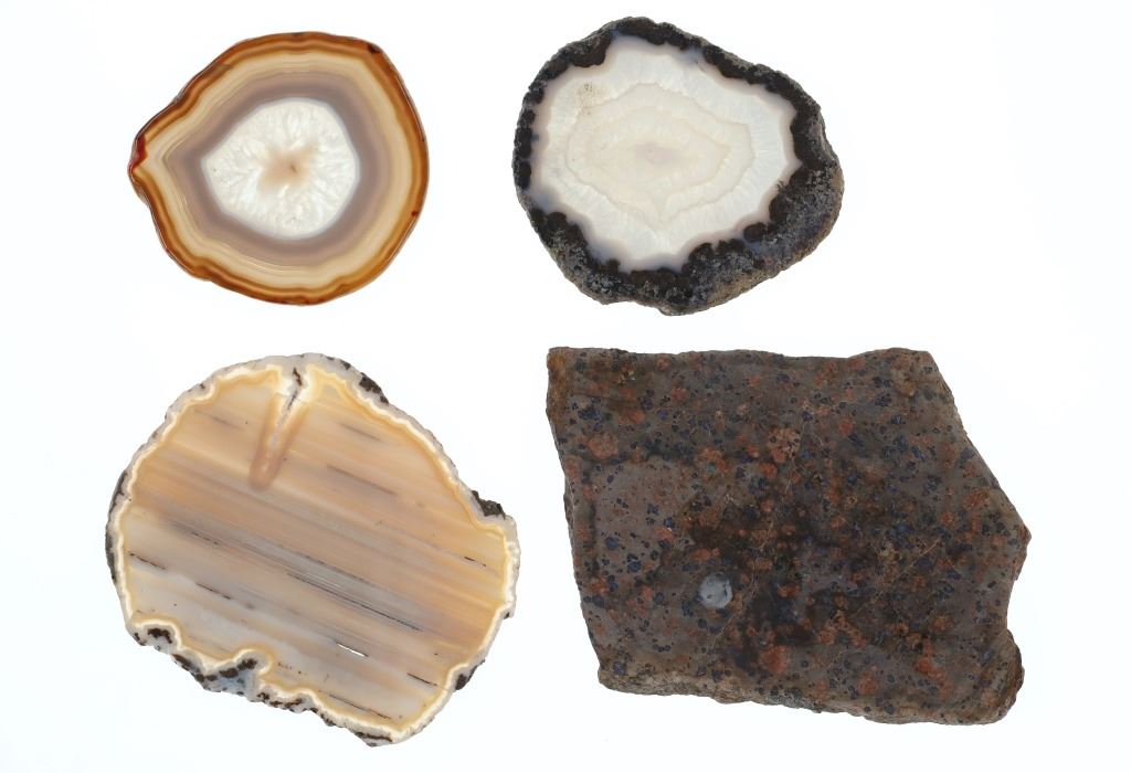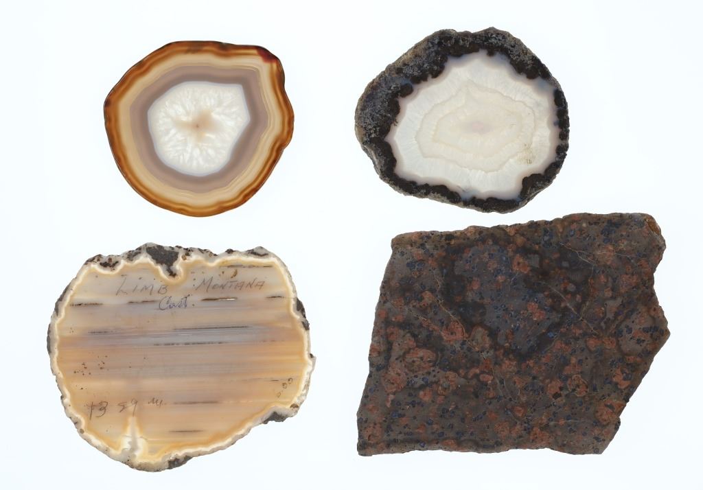 For your consideration is this lot of three agate slabs and one Llanite slab from Texas. Llanite is a porphyritic rhyolite with distinctive phenocrysts of blue quartz (a rare quartz color) and perthitic feldspar (light grayish-orangish). The brown, fine-grained groundmass consists of very small quartz, feldspar, and biotite mica crystals. The Llanite slab shows colors of brown, brown/red, orange, blue and purple throughout the slab. The first agate slab shows a highly polished and smoothed look with colors of brown, grey, light blue and white. The second agate slab has smoothed sides and one side being highly polished. It shows a more rocky outer layer than the first one, with the agate in the center showing colors of cloudy light blue, grey and white. The third and largest agate slab in this lot shows smoothed sides with one side being highly polished. On the unpolished side it reads, "Limb Cast Montana" showing that the agate was found in Montana and the agate was formed in a tree limb. Limb Casts are created when agate is deposited in cavities formed by tree branches covered by volcanic ash. The wood burns away after being covered by the hot ash. Under the right conditions agate fills the empty space. The result is a piece of agate that has the form of a tree limb, hence the name limb Cast. This piece of agate shows stripped colors of white, grey, beige, light blue and tan. All the pieces in this lot show good condition with no signs of obvious damage. The Llanite slab measures 4 3/4" L x 6 1/2" W, The smallest agate slab measures 3 13/16" L x 3 1/2" W, while the largest agate slab measures 4 1/2" L x 5 1/4" W.