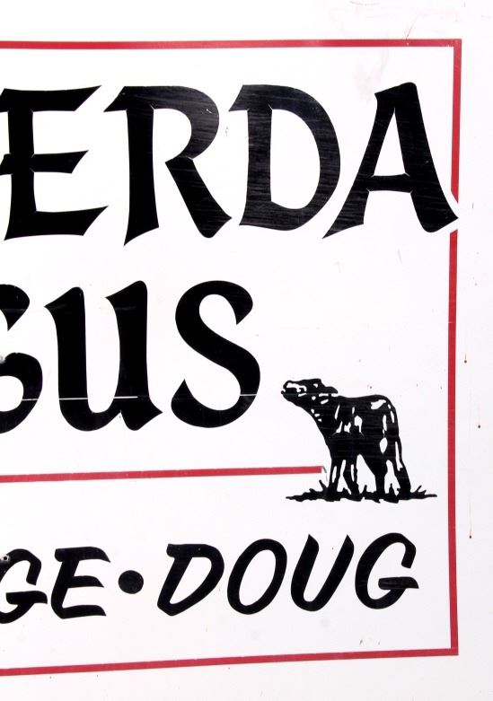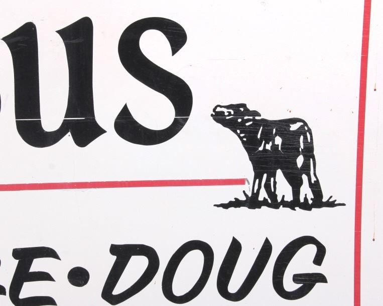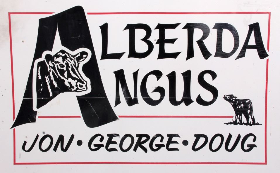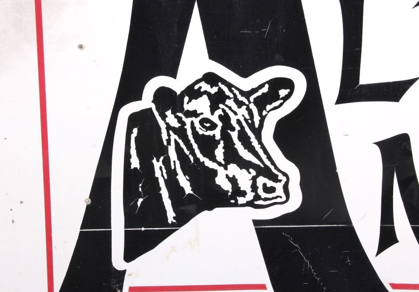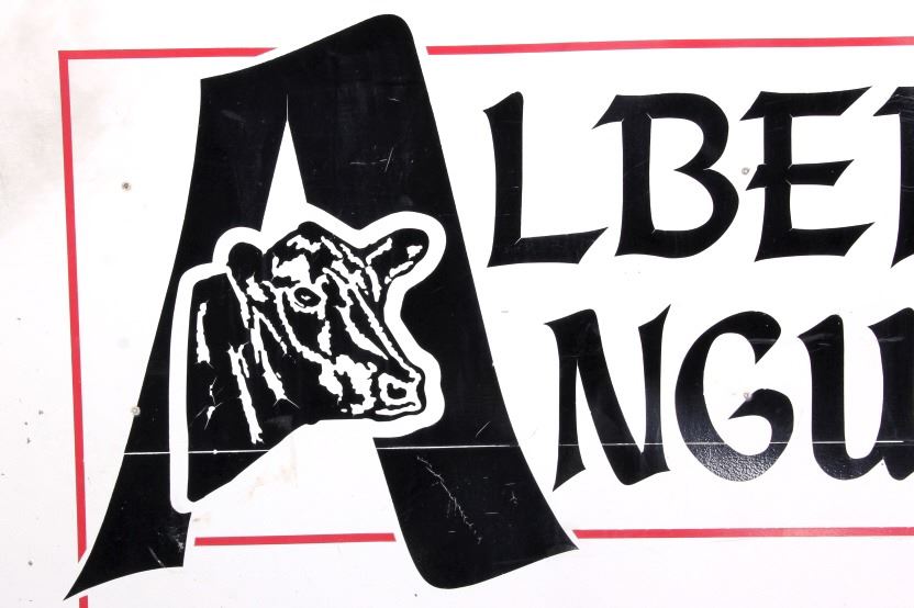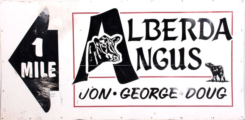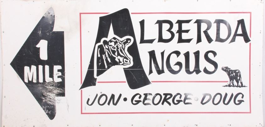 This is an original Alberda Angus sign from Montana. The sign is tin and features a great graphic image of an angus cow in the "A". The sign is in good overall condition with some damage as shown. The sign measures 48" x 96".
