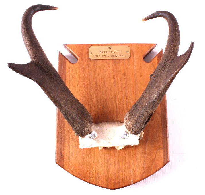 This is a pair of Montana antelope horn mounts. Each set of horns is mounted to a solid wood plaque. The larger set of horns has a tag that reads "1994 Jardee Ranch Mill Iron, Montana. The horns measure 14.5" at the widest point. The smaller set of horns has a tag that reads "1996 Jardee Ranch Mill Iron, Montana". The horns measure 11.5" at the widest point. Both mounts are in good condition.