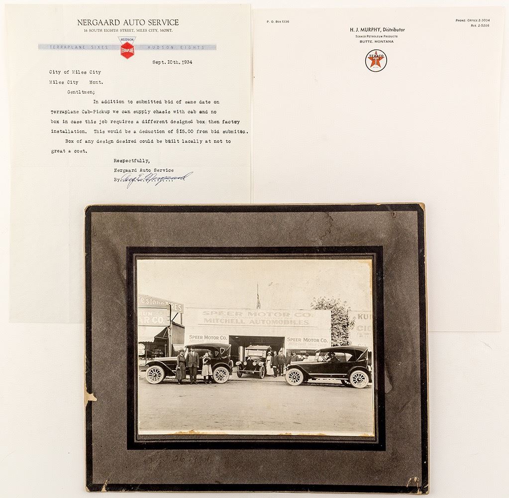 1) Photograph of Speed Motor Co., Mitchell Automobiles. Photo shows 3 autos with people in front of them. Mounted 9.75" x 11.5. 2) One letterhead, Nergaard Auto Service, Miles City, Mont., 1934. Putting in a bid on a Terraplane Cab-pickup. 3) One letterhead, H. J. Murphy, distributor, Texaco Petroleum Products, Butte, Montana. Blank. Both letterheads are in color! Date: Location: Montana HWAC # 44168