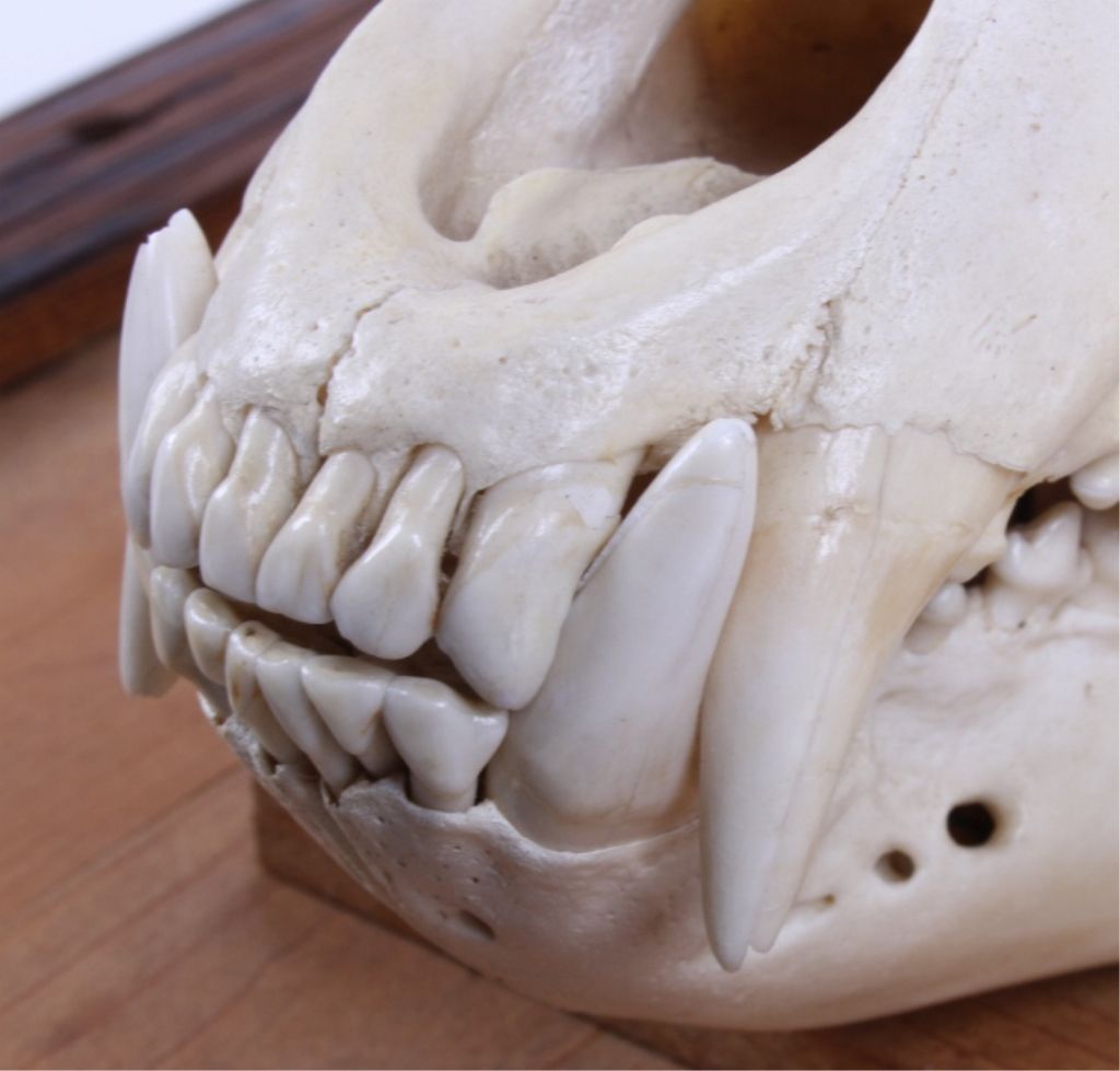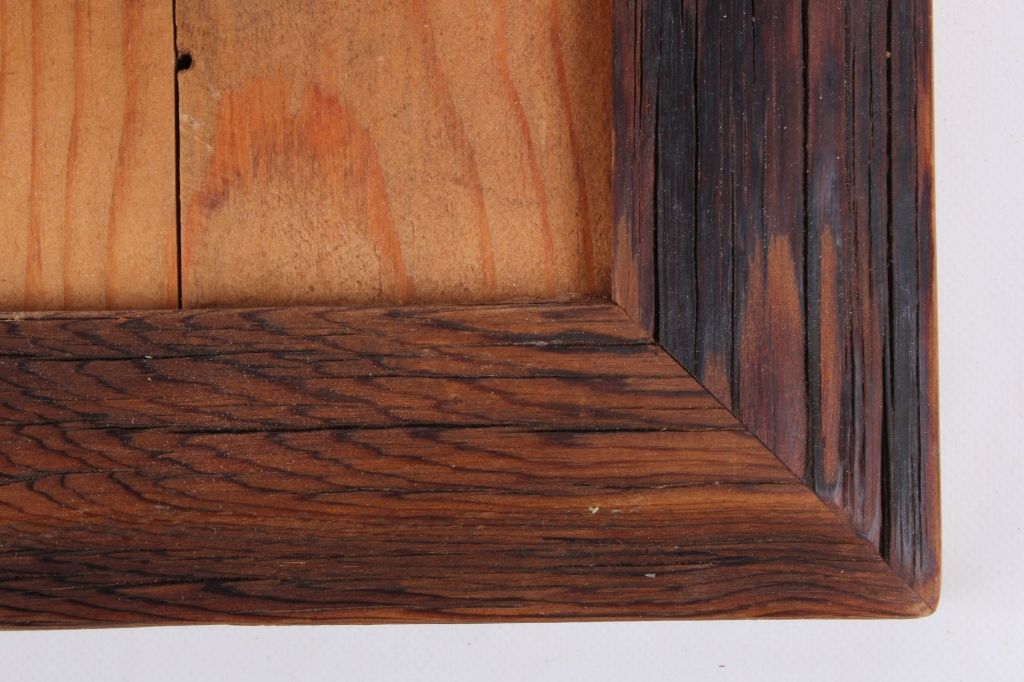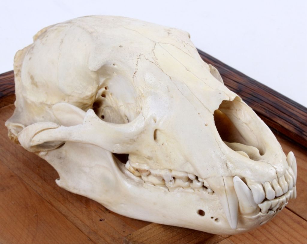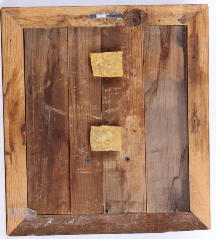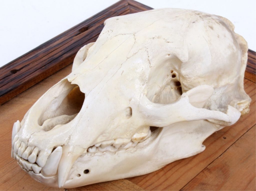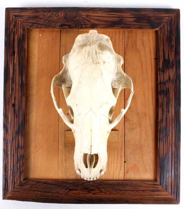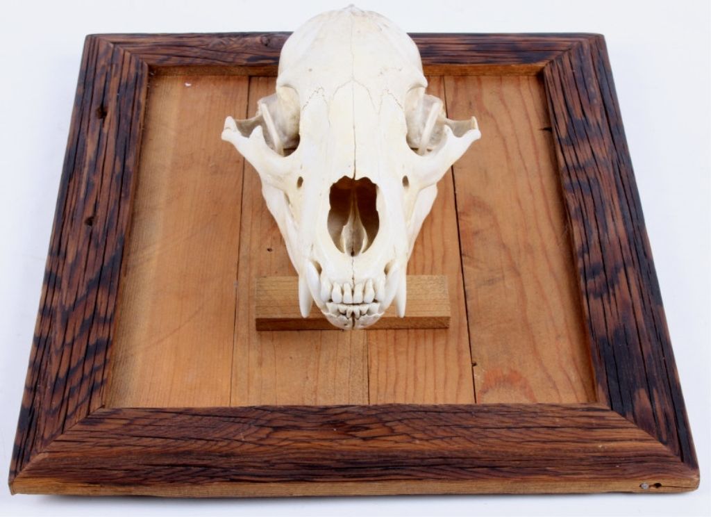 The lot shows an original Montana taken Black Bear skull in good condition on a rustic barn wood frame. The frame measures 13"x14.5"and the skull measures 9.5"x5.5"