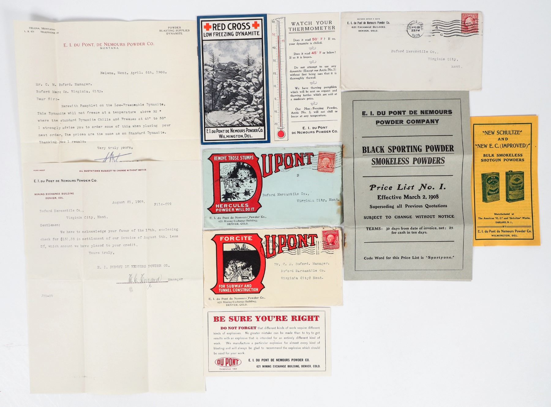 Lot of 10. E.I. du Pont, De Nemours Powder Company of Helena, Montana and Denver, Colorado, including letterheads, covers, a brochure for Red Cross Low Freezing Dynamite, price list for Black Sporting Powder Smokeless Powders, and more. Correspondence is addressed to HR Buford in Virginia City, Montana.