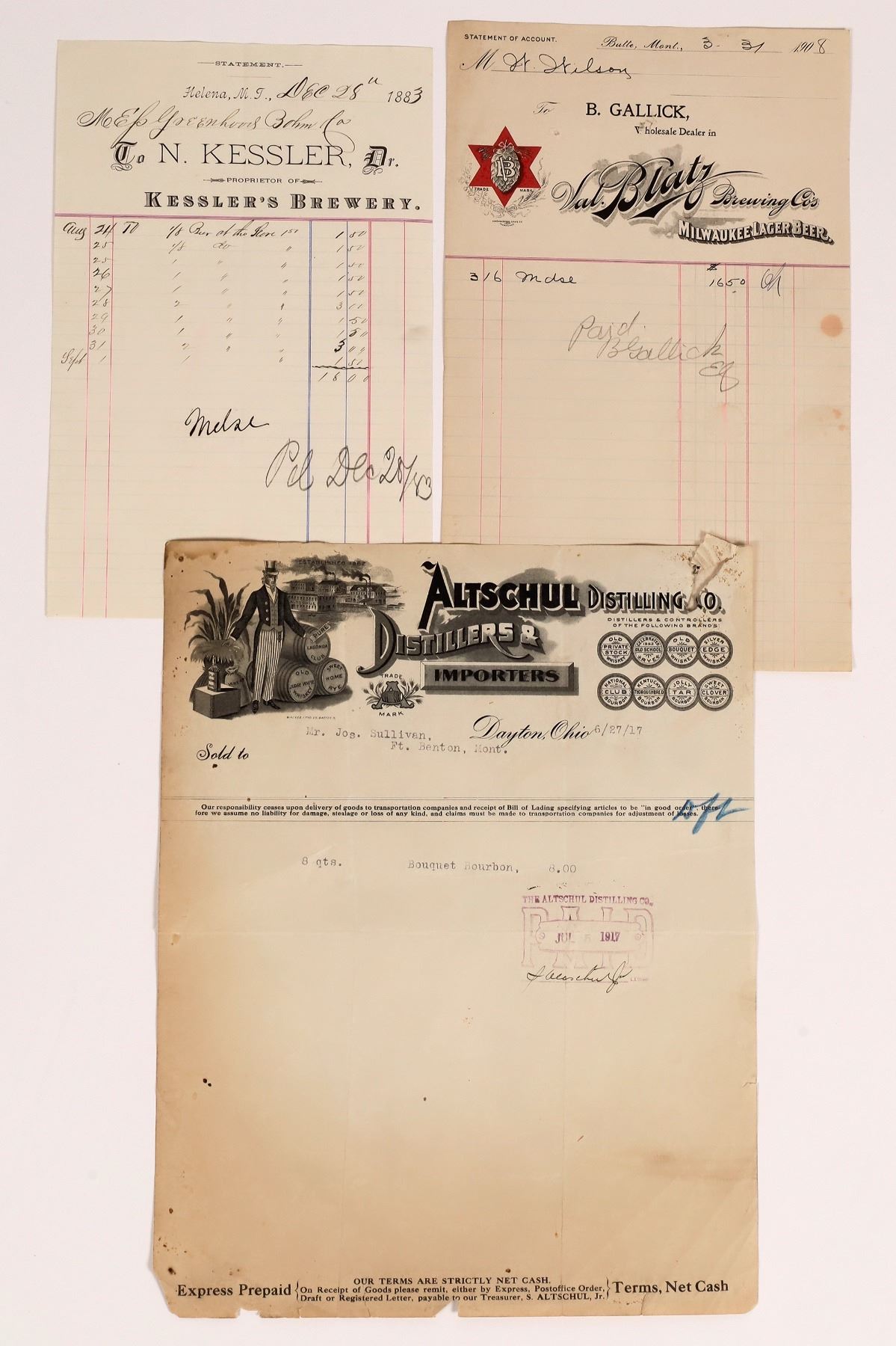 Three pieces of Montana brewing history. 1) Pictorial letterhead from the Altschul Distilling Co. of Dayton Ohio to Mr. Jos. Sullivan, Ft. Benton, Montana dated 6/27/1917 for eight quarts of Bouquet Bourbon. 2) Statement of Account from B. Gallick, wholesale dealer in Blatz Brewing Co.'s Milwaukee Lager Beer, datelined Butte, Montana, 3/31/1908. 3) Statement dated Helena, M. T. Dec. 28th, 1883 to N. Kessler proprietor of Kessler's Brewery.