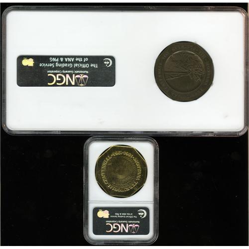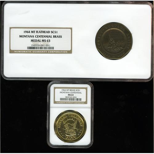 <B>Montana Centennial Two-Piece Lot.</B></I> Consists of a <B>1964 Montana Centennial Medal MS63 NGC,</B></I> obverse with Charles Marion Russel artwork, reverse with mining gear vignette and commemorative inscriptions, struck in orange-brown brass; and a <B>1964 Montana Centennial So-Called Dollar,</B></I> design an obvious nod to the Humbert fifty dollar slugs, struck in bright yellow brass.<BR><BR><b>Shipping:</b> Coin/Currency (<a target="_blank" href="http://www.heritageauctions.com/common/shipping.php">view shipping information</a>)