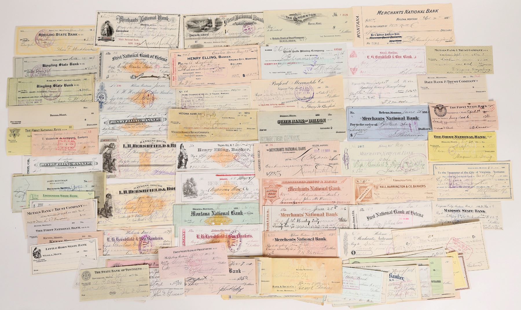 144 different Montana checks, c. 1870's-1940's. Helena, Butte, Virginia City, Wyola, Townsend, Philipsburg, Rexford, Poplar, Manhattan, White Sulphur Springs and many more.