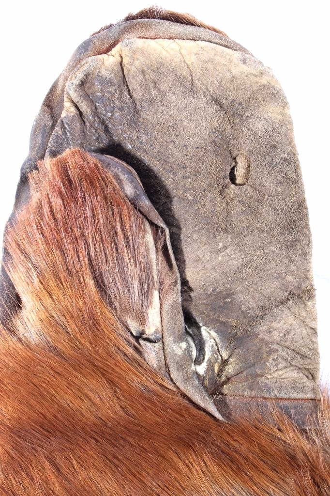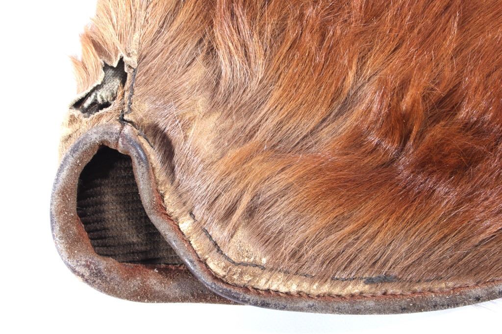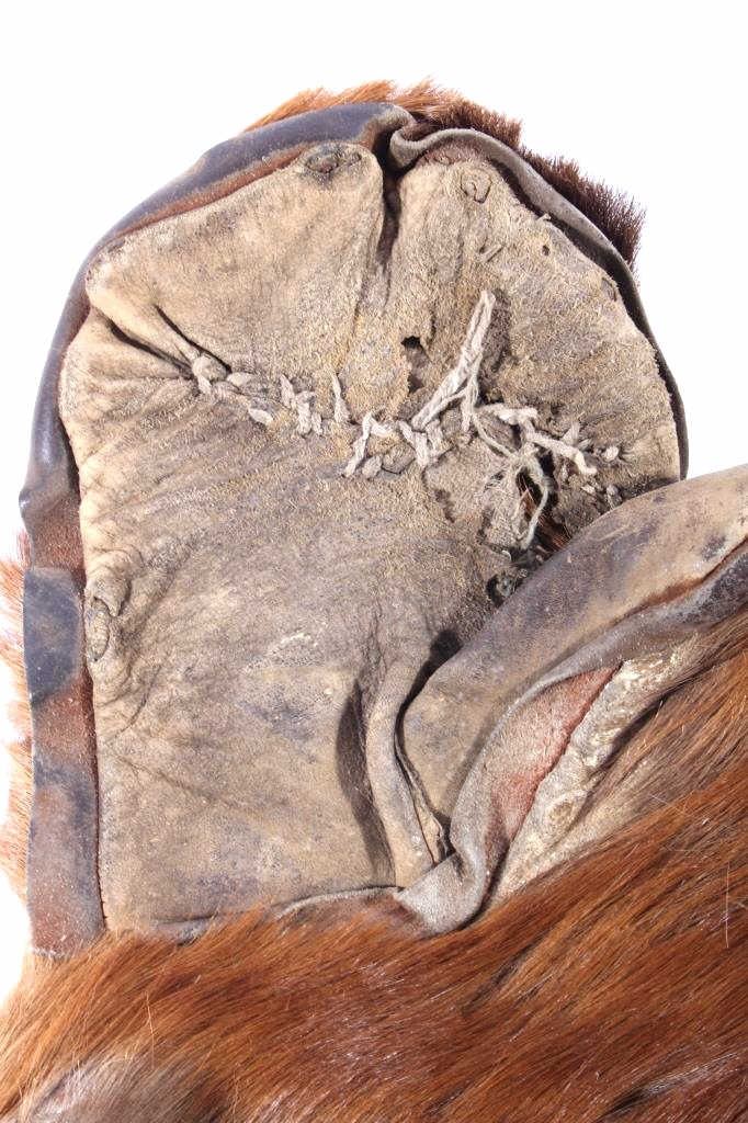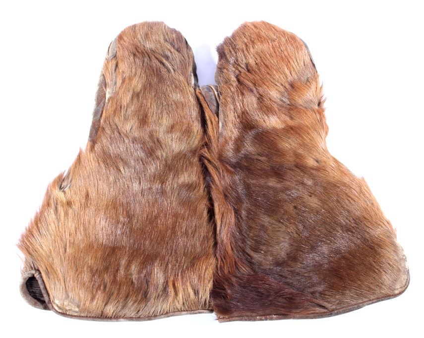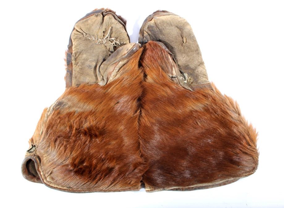 This is a set of circa early 1900 steer hide fur and leather gauntlet gloves from a Montana Cowboy. Provenance: The pieces come from an extensive Western Cowboy Early Montana Billings, Montana private collection and are thought to be from an early Western Montana homestead. The gloves show a rich brown steer hide and well used leather palms. The glove present and display very well. Each glove measures 16"L x 10.5"W.