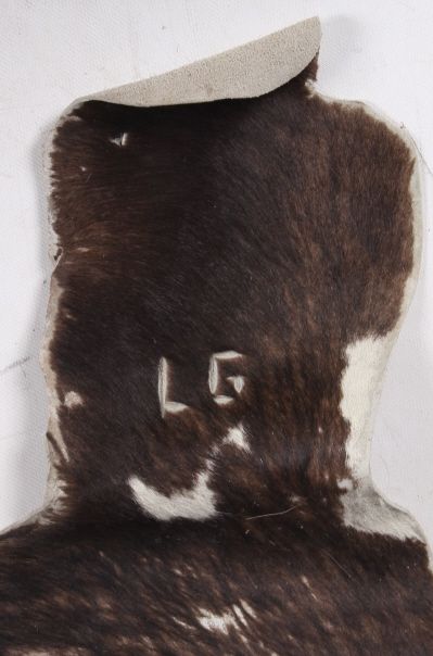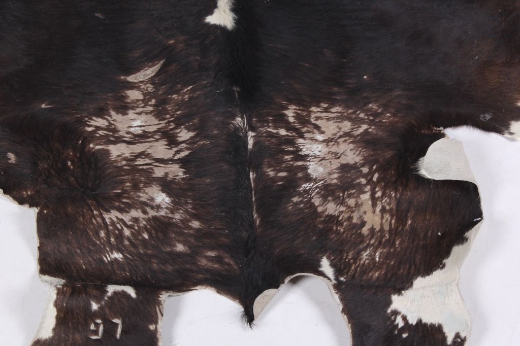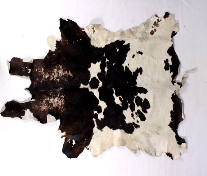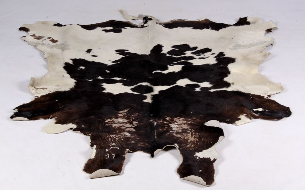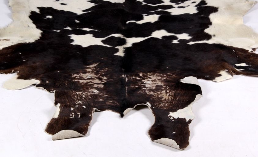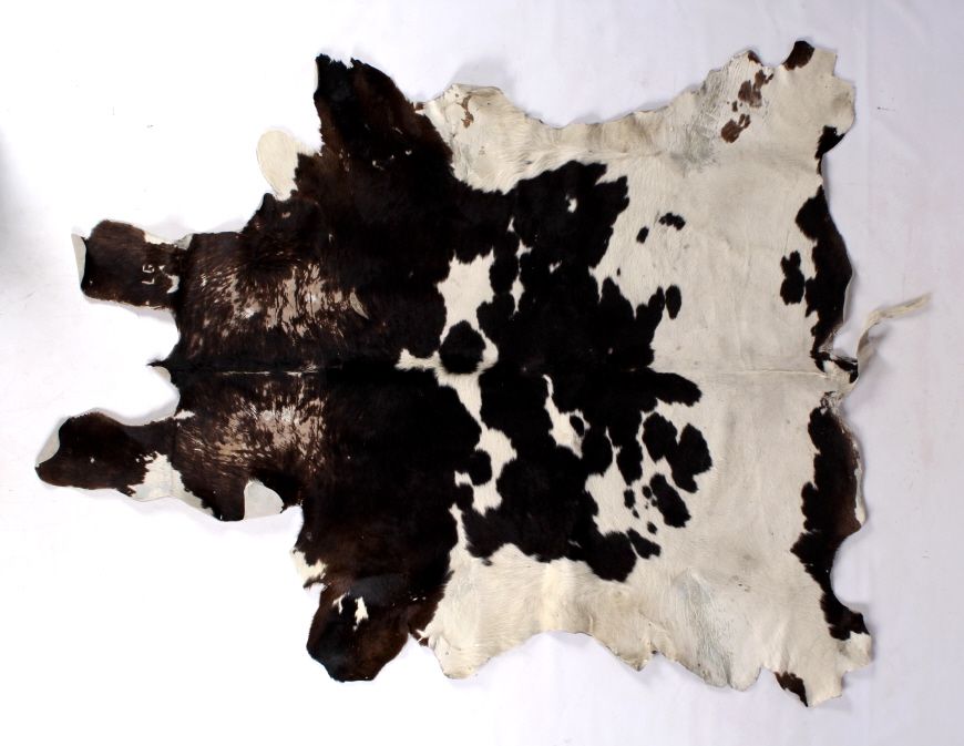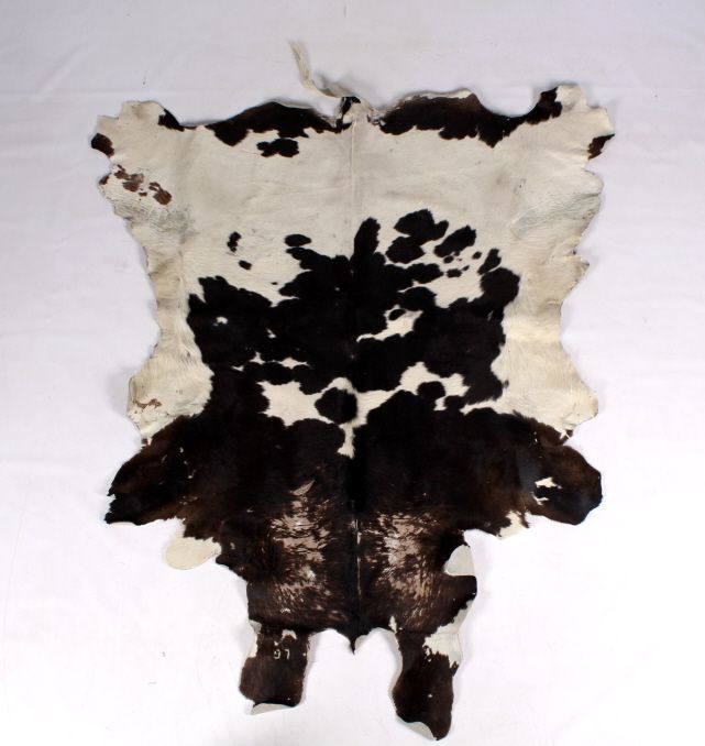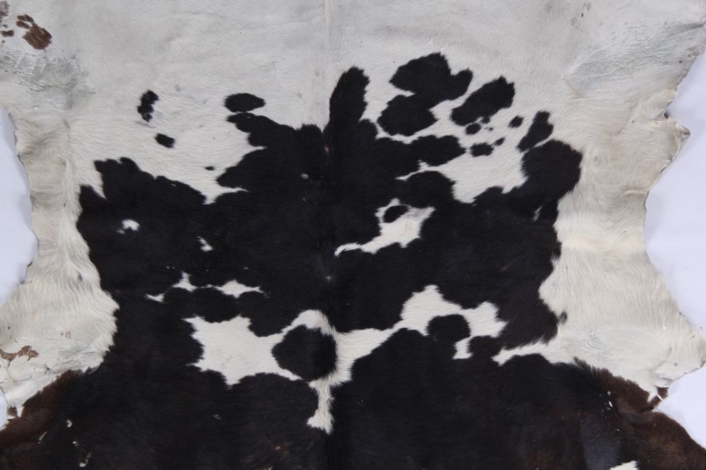 This is a Montana Cowhide rug showing a black and white coloring. This piece has been tanned and shows overall good condition with some fur loss across top. The hide makes a great display piece and measures 58.5"x80" w/ tail.
