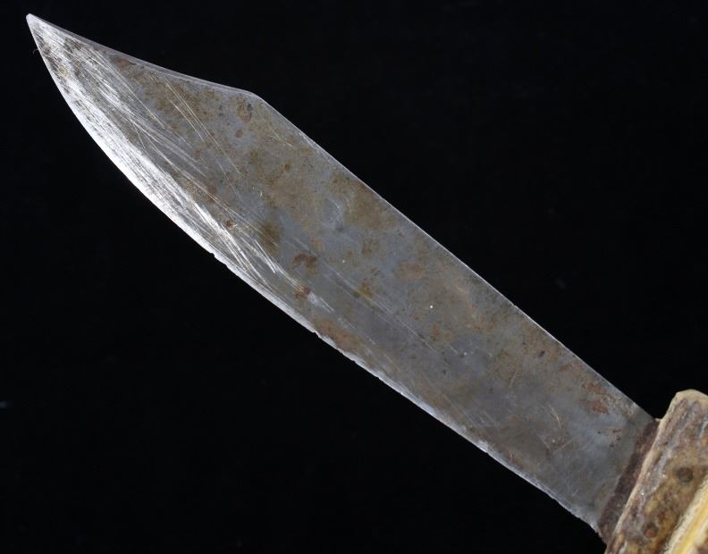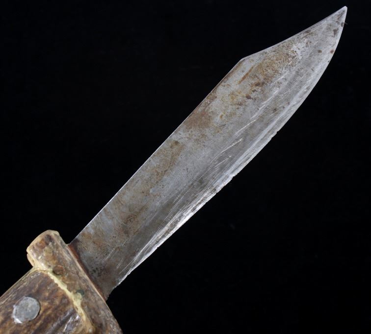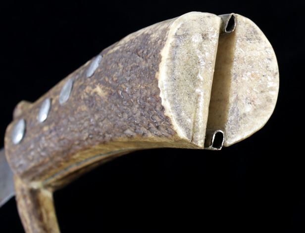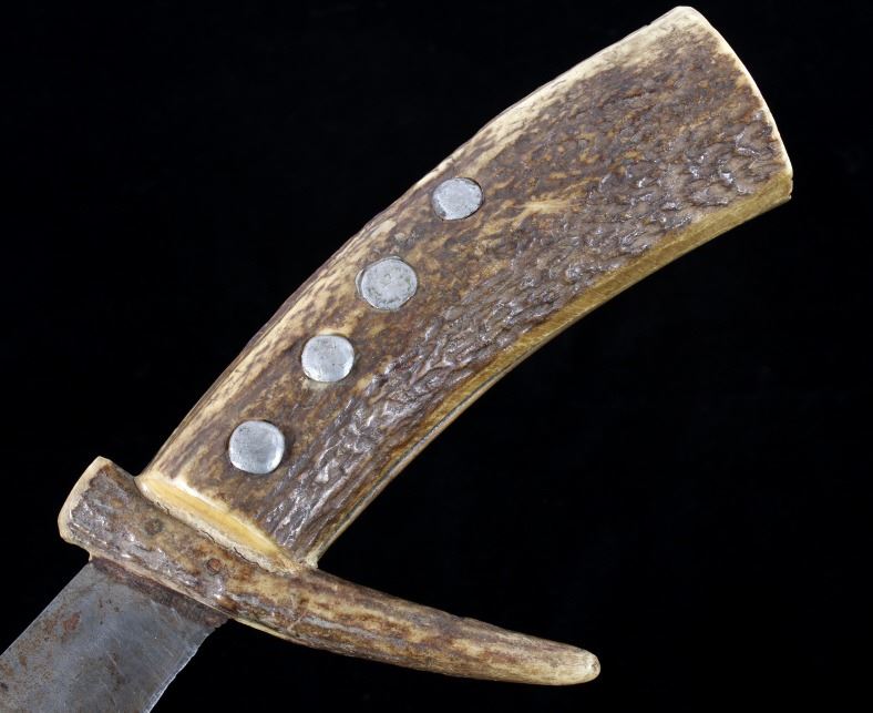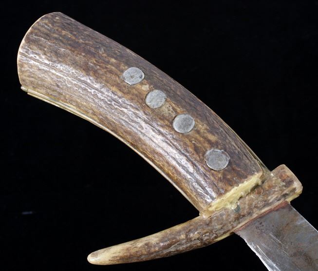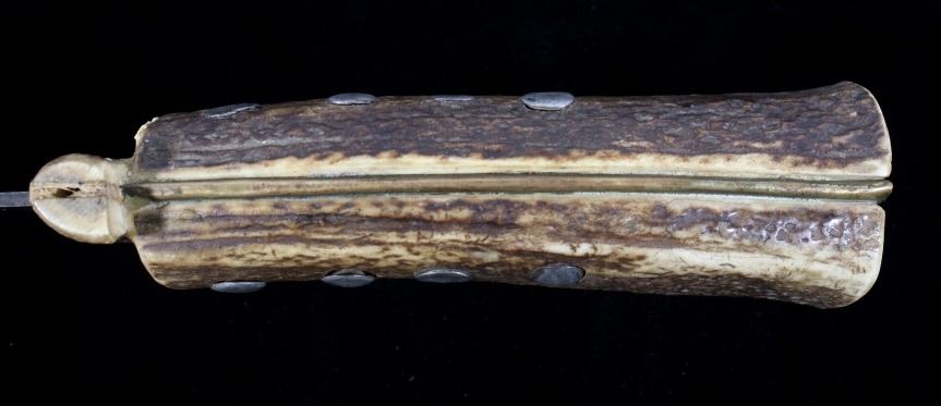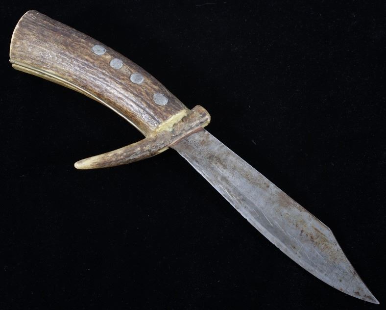 The lot features an excellent original circa 1900-1920's bowie knife with elk antler handle from the Crow Native American Indians of Montana. The piece shows a heavy iron forged bowie knife clip point blade which is paired with a set of heavy large Rocky Mountain Elk antlers having an elk tine finger gaurd. The deeply colored beautiful elk stag antlers are attached to the tang with three iron studs having poured pewter ends. The knife is fitted with a lining of copper around the handle joints. Provenance: From a large Cowboy and American Indian Montana collection in Billings, Montana. The Piece measures 13 1/2" long overall with a 7 1/2" long blade.