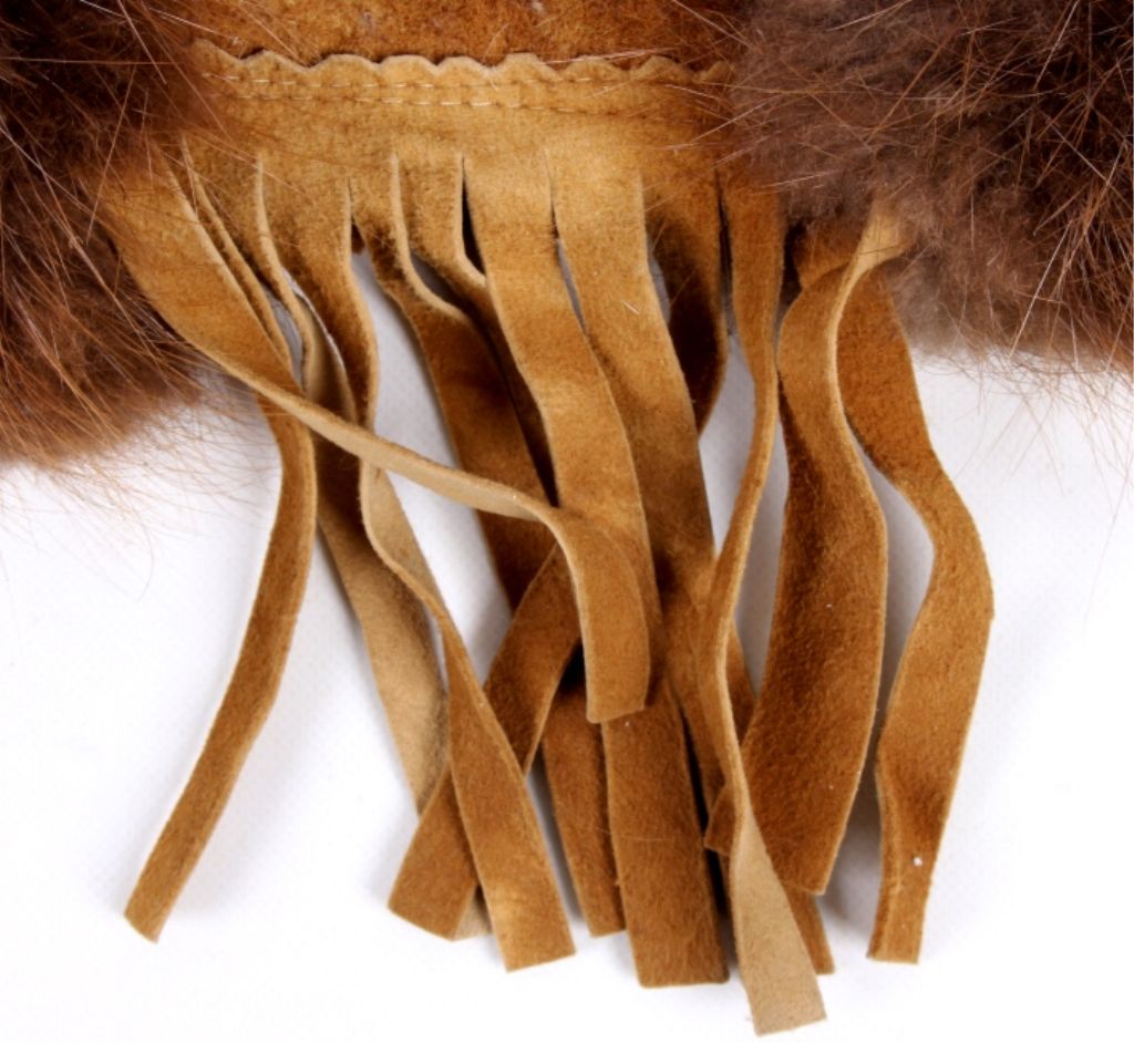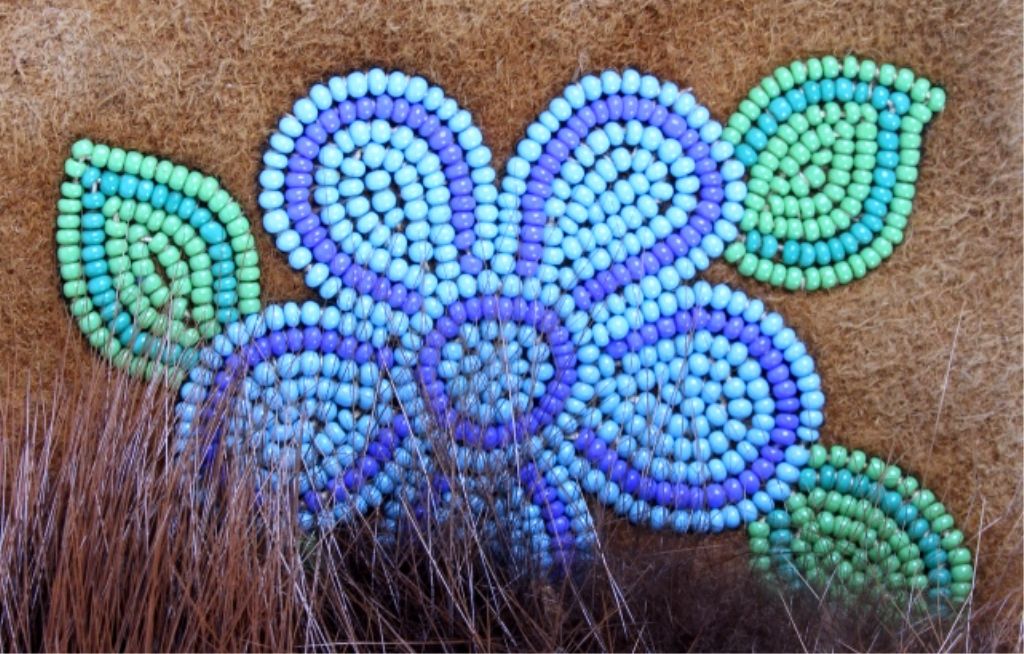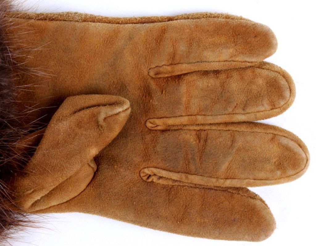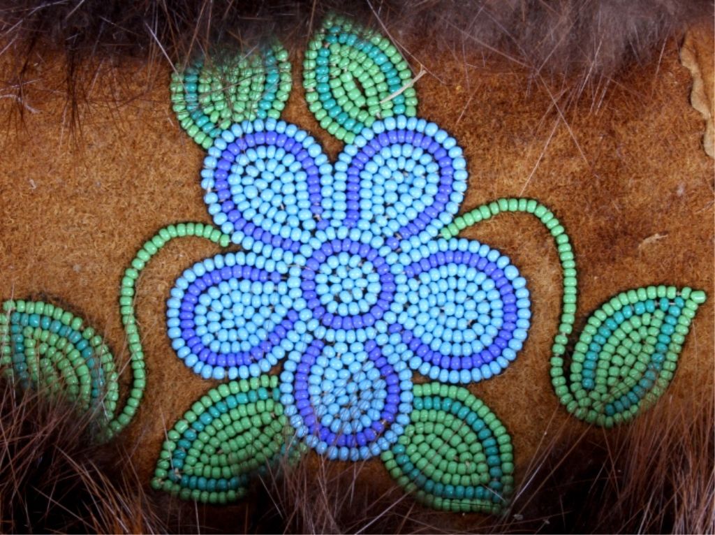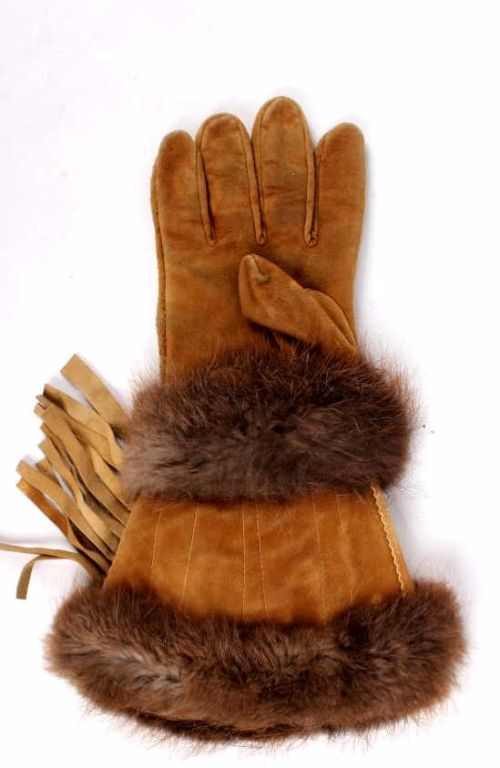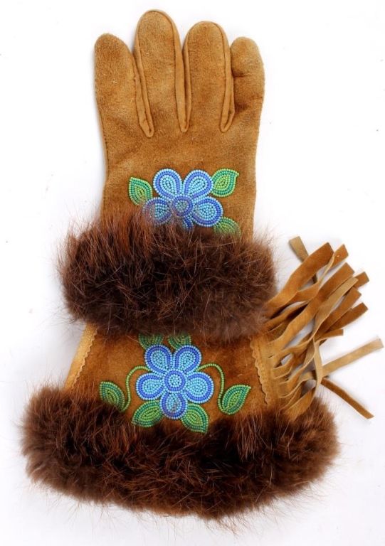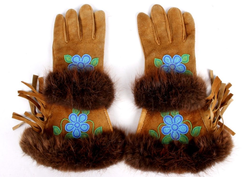 These are grest condiotnion original handmade Crow native american beaded gauntlet gloves. The gloves feature buck skin tanned leather, flawless beaver fur edge and tightly beaded floral Crow designs. The inside of each glovehas an early calico and are most likely from the mid to early 1900's. Measures 14.5"x8.5".