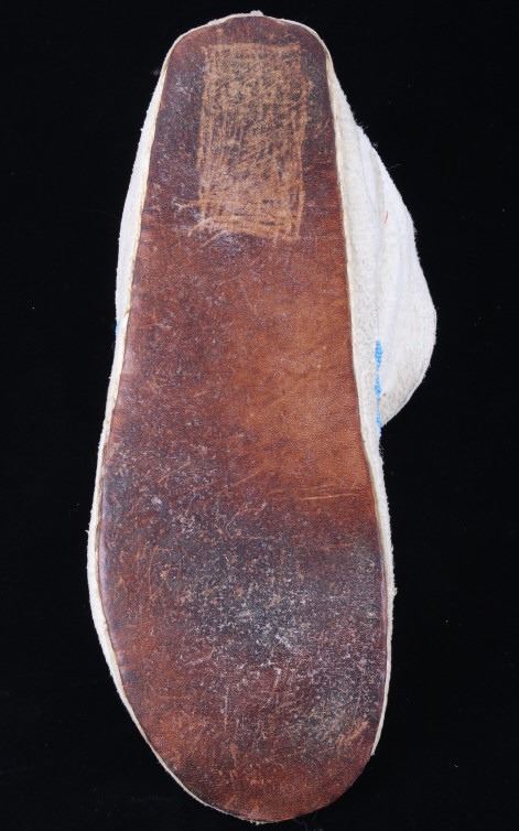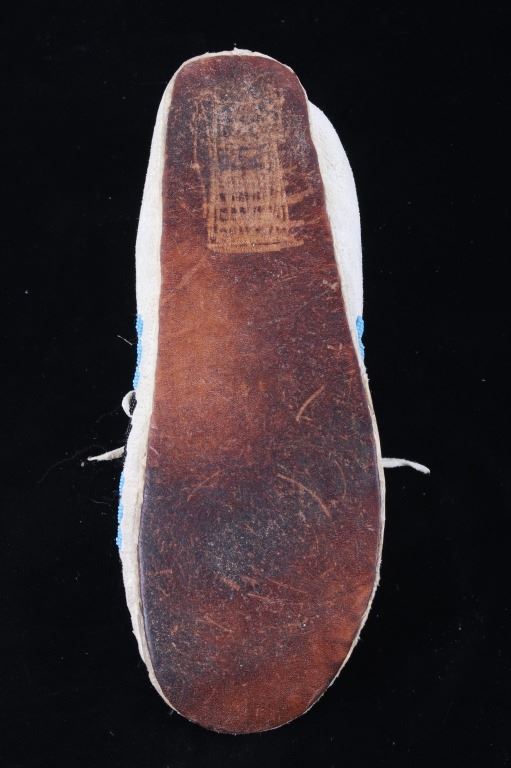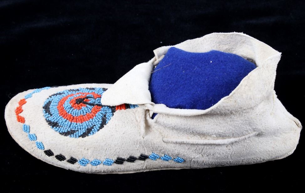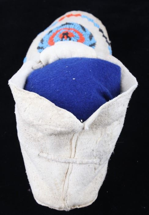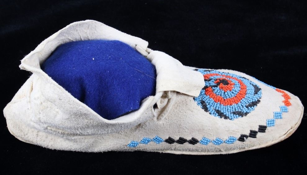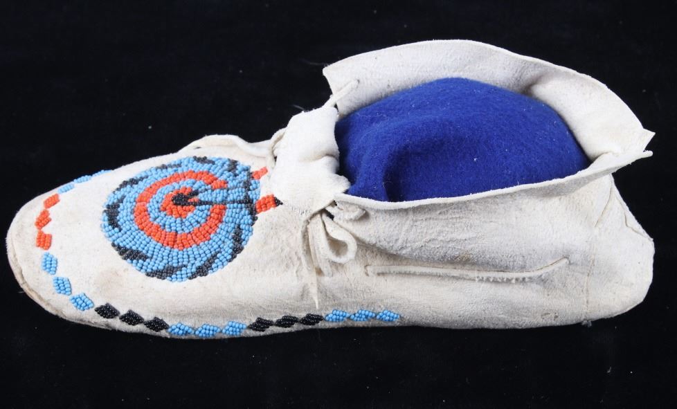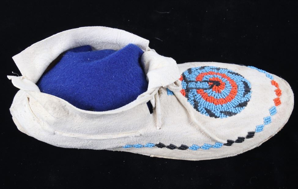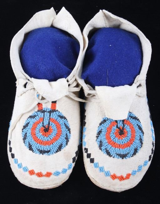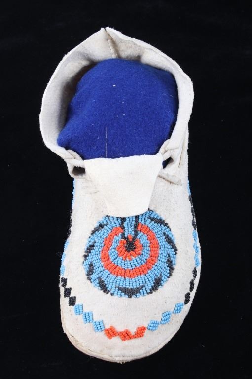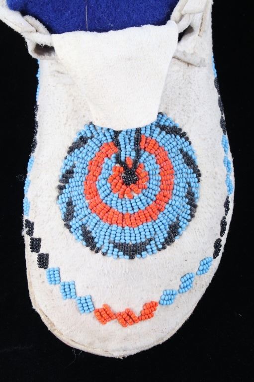 The set shows a set of hide beaded moccasins from the Montana Crow Native American Indians and dating to circa 1940-1950’s. The piece shows an Indian tanned hide with harness leather hard soles being adorned with early glass trade seed beadwork all being sinew sewn. The tops of the moccasins are adorned with a unique and desirable Key Hole or Keyhole beaded pattern, a unique and desirable design show in such colors as medium blue, orange and black. The moccasins show a medium height ankle with original hide tie straps. The hard soles exhibit a nice foot worn patina from honest age and use, a true attribute of age. The set is in good condition with little to no bead loss. Provenance: From one of the most prominent American Indian Collections in Billings, Montana where the set was found to be an authentic example. Each moccasin measures overall 10.5”L soles by 3 5/8”W by 3.5”H ankle.