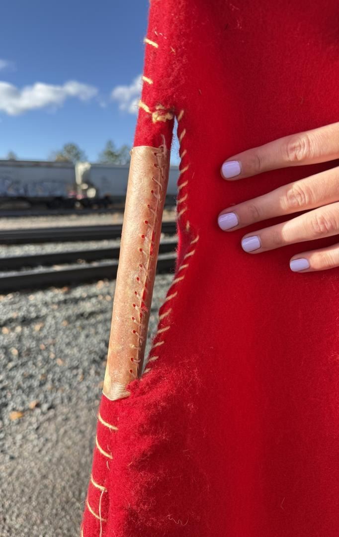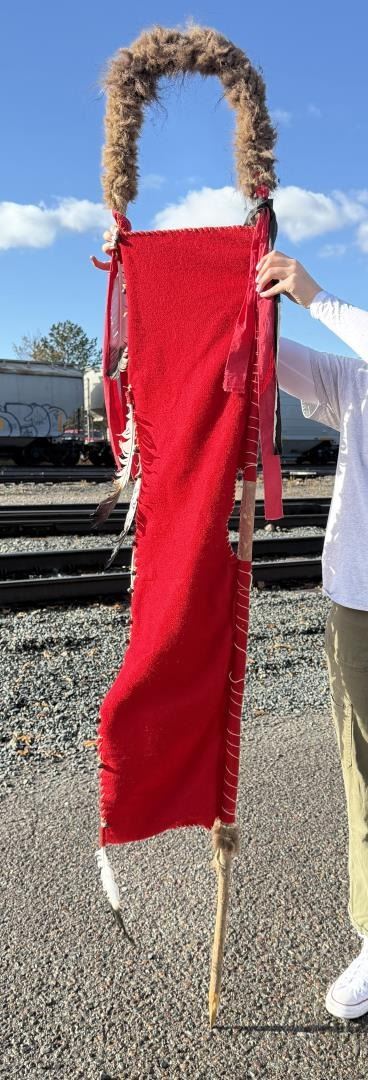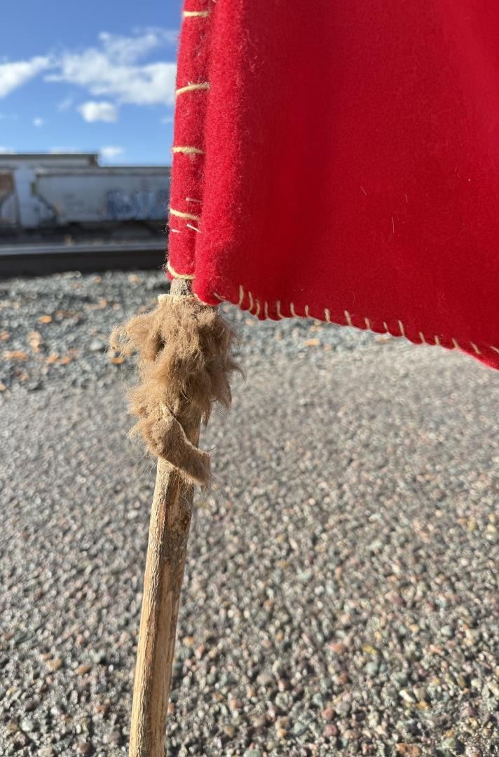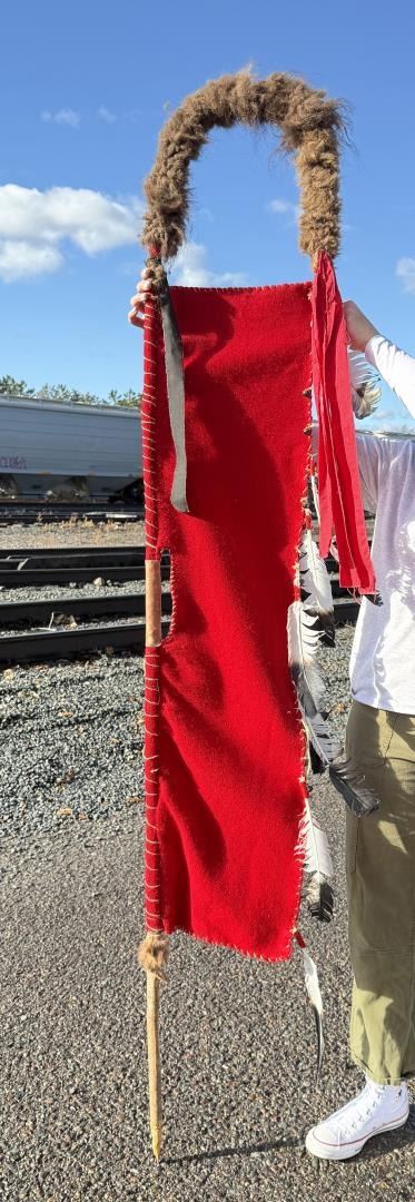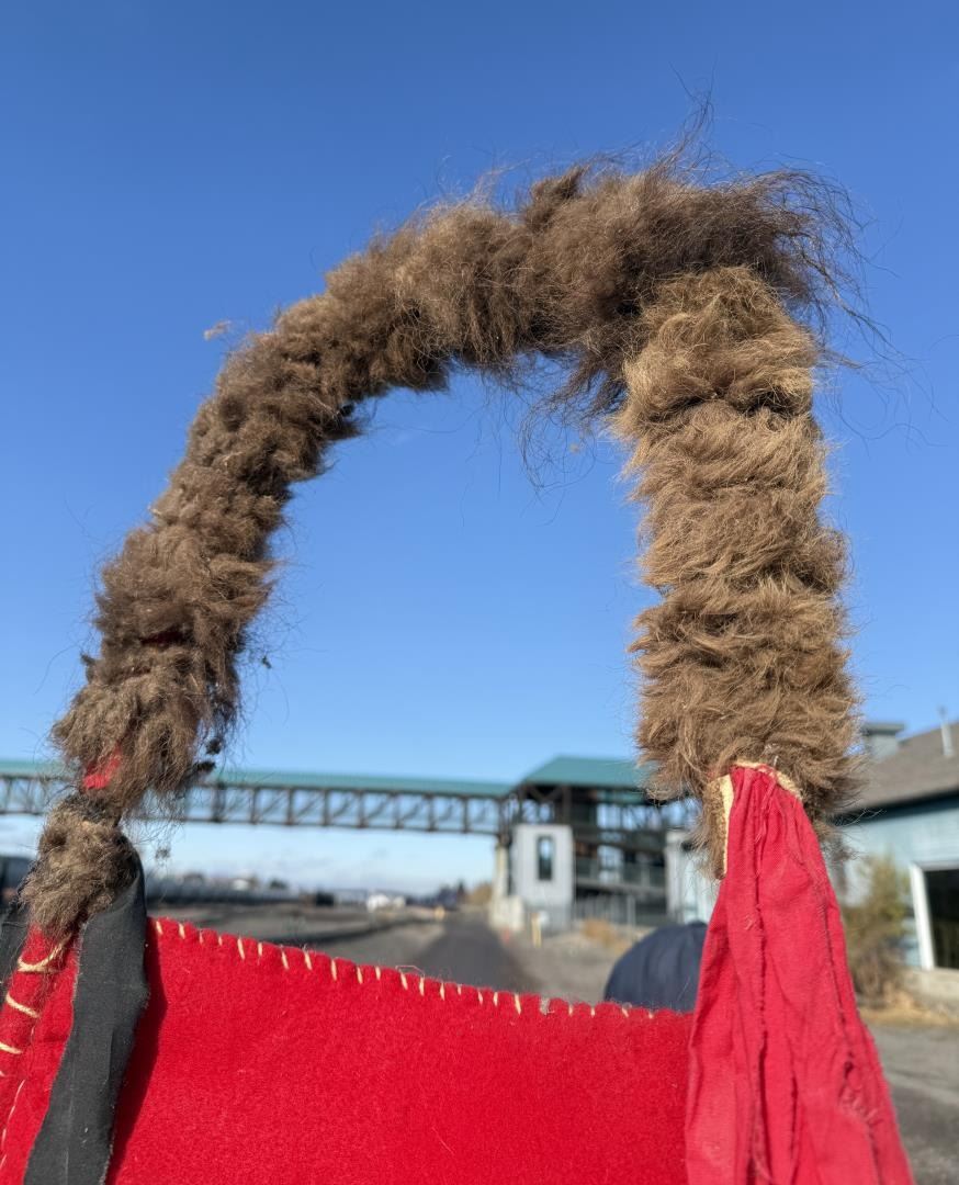 81" long. Buffalo hide wrap. Turkey feathers. Mid 20th Century.