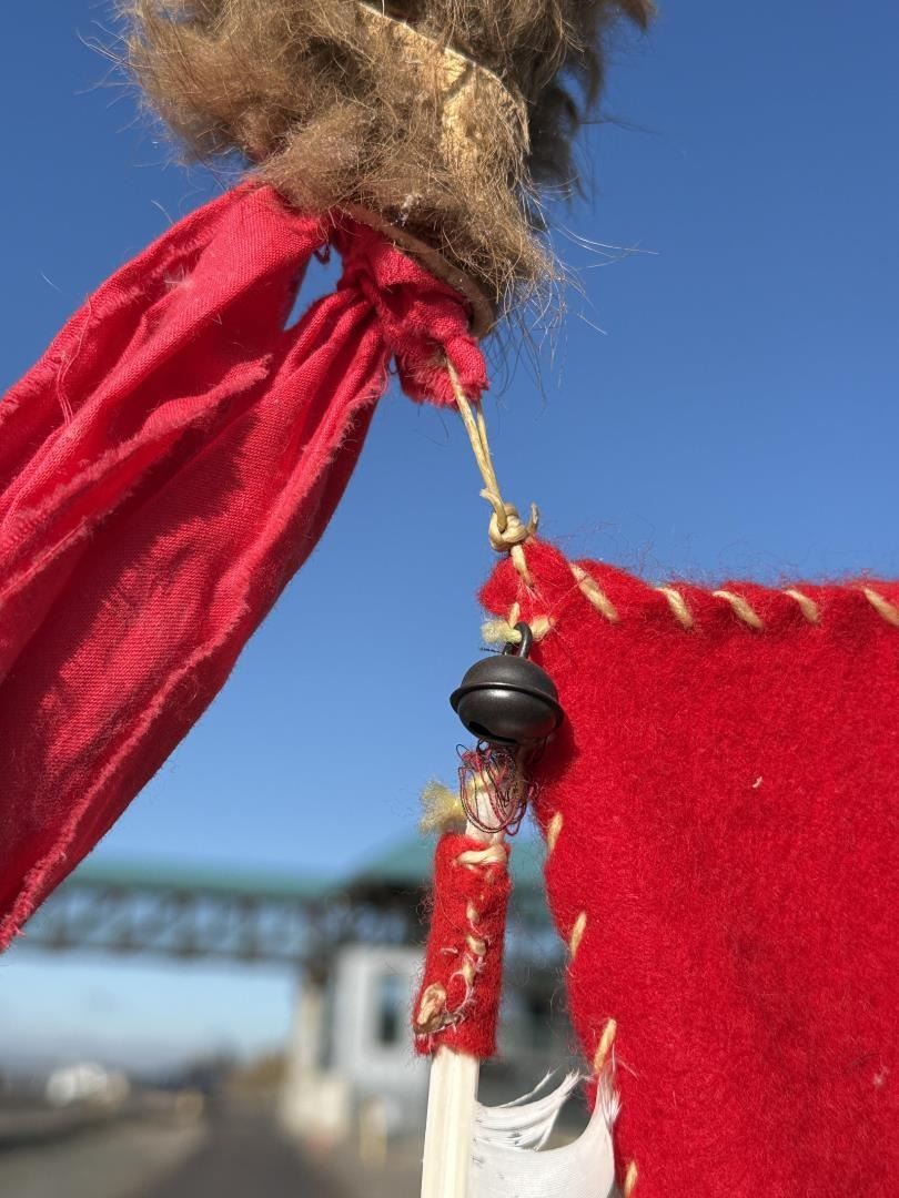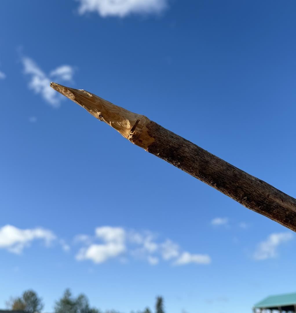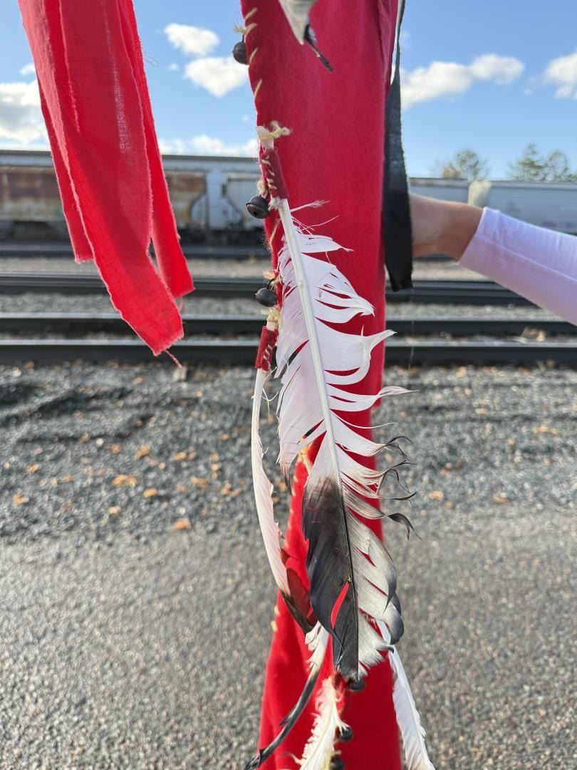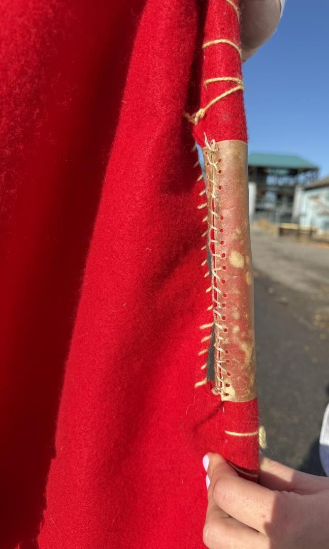 81" long. Buffalo hide wrap. Turkey feathers. Mid 20th Century.