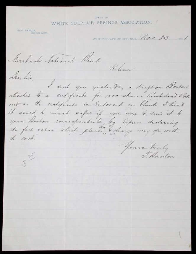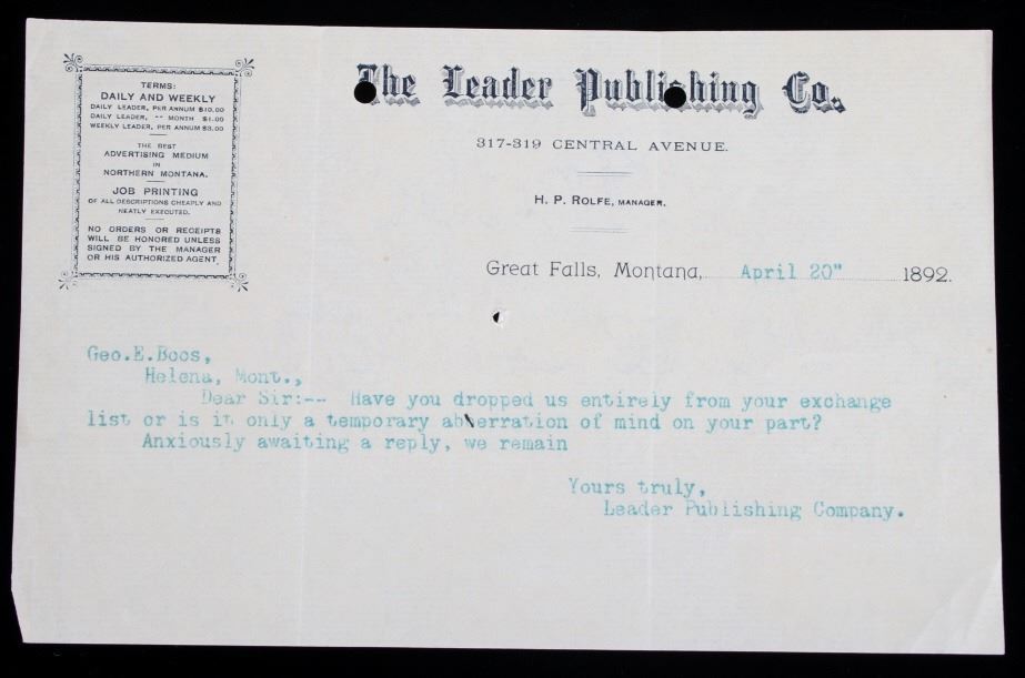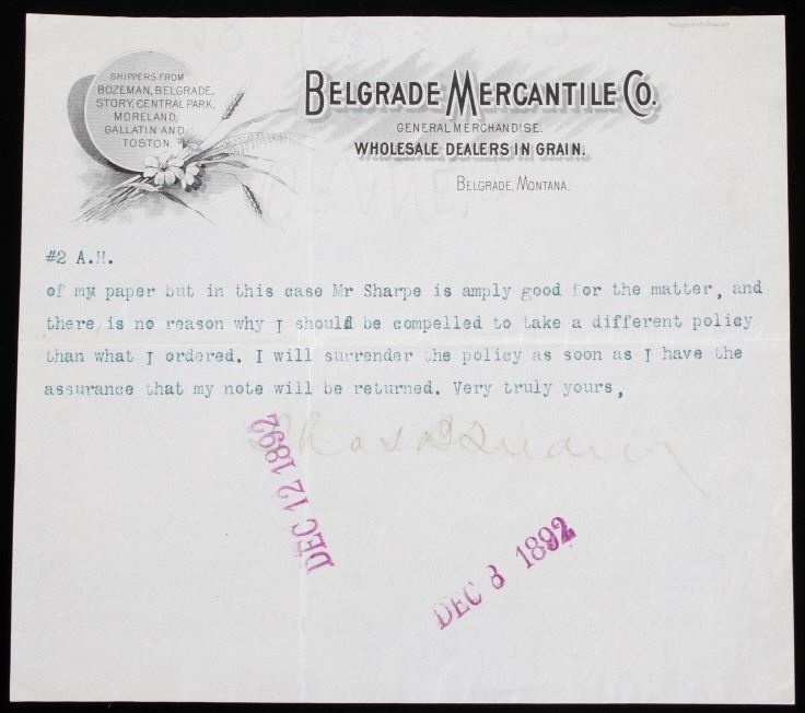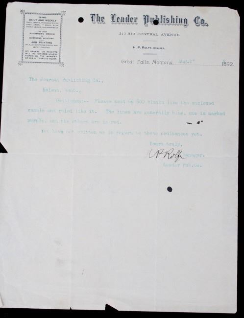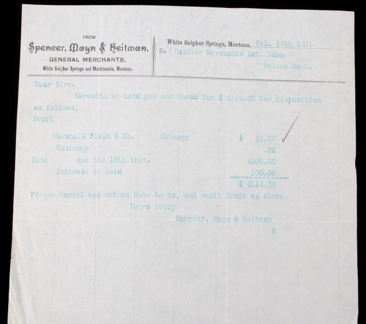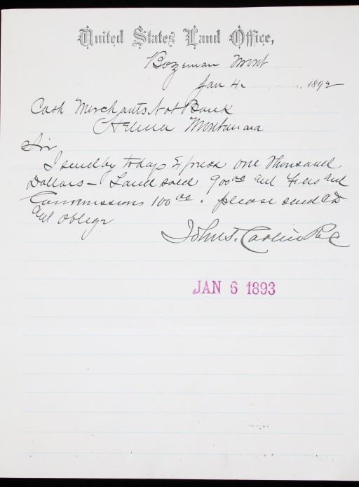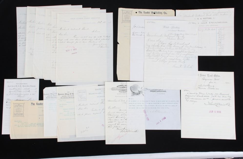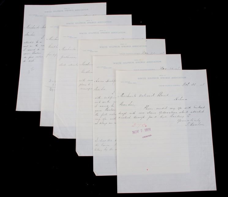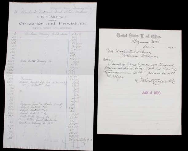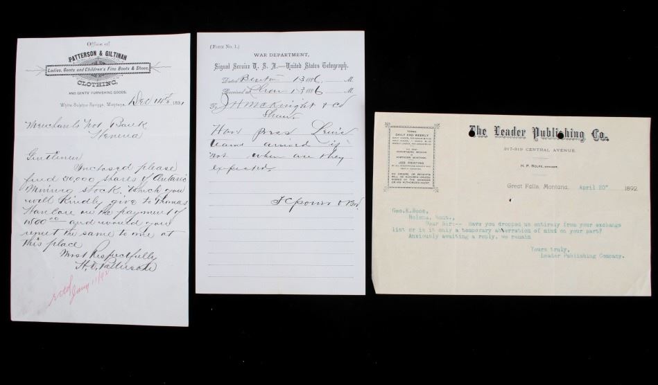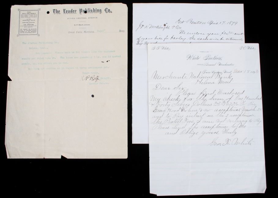 Featured in this lot is this Montana ephemera collection with dates ranging from 1879 - 1897. There are sixteen total receipts and personal memos in this collection. The first grouping is a string of six memos and receipts from White Sulphur Springs Association and dated from 1891. The second is a pair of personal memos from The Leader Publishing Co. and dated from 1892. There are two receipts from Spencer, Mayn & Heirman. There is a personal storage memo from Babcock & Miles Wholesale and Retail. The next is a personal memo enclosing information on stock shares and dated in 1891. The next is a Belgrade Mercantile Co., General Merchandise out of Belgrade, Montana and dated 1892. There is a grouping of three letters dated from 1879 and 1892 from the United States Land Office and a personal memo from the office of White Brothers. The other two include a US telegraph from the War Department and H.H. Potting Groceries and Provisions for choice wines and liquors. The condition of this ephemera collection is good for the items’ age. The measurements of this collection range from 5 1/2" x 8 1/2" to 14" x 8 1/2".