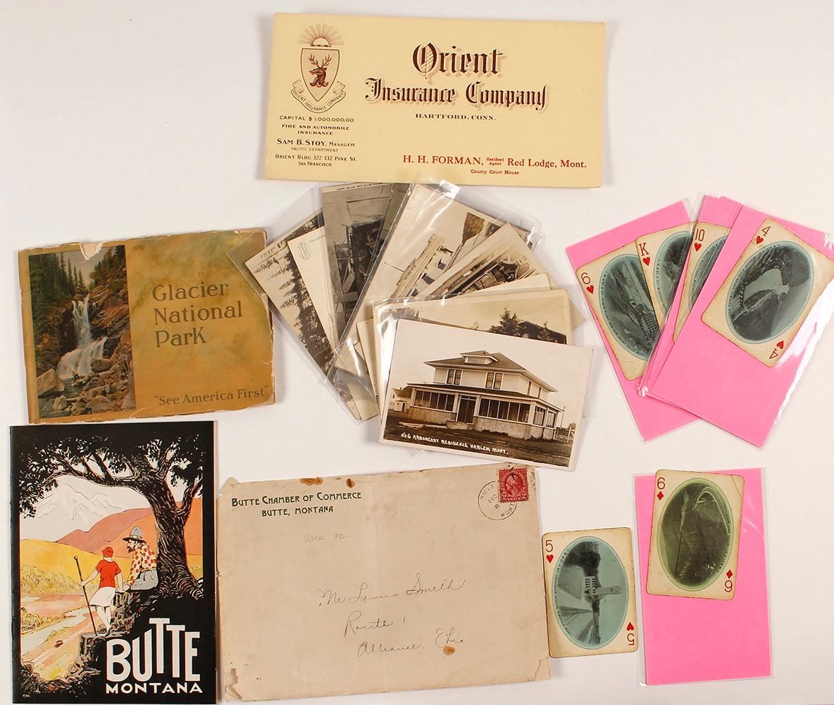 Lot of 25. 1) 1930 Booklet and cover from the Butte Chamber of Commerce.21 pages with black and white photos. 7.75" x 5.75" 2) Twelve postcards, including 7 real photo: Mine cages in Butte mine (1931); Montana Mammoth Mine (Thompson cancel); Arborcast Residence in Harlem, MT (unused); McGinnis Residence in Harlem (unused); First National Bank in Libby (unused); Lewis Glacier hotel (unused); Libby, MT bird's-eye (unused); four other Butte mining scenes, one mailed 1910; and one of Glacier Hotel interior. 3) Red Lodge, Montana ink blotter for HH Forman, Orient Insurance Company. 4) North Butte Mining Co. weekly report, unused, 19--. 15.5" x 16". 5) Nine Electric Railway playing cards with Montana railroad locations on the face. 6) Booklet for Glacier National Park. No date. Published by Kiser Photo Co., Portland, Oregon. Approx. 50 pages of color scenes. Rips and other wear. (Prag Collection) Date: Location: Montana HWAC # 54795