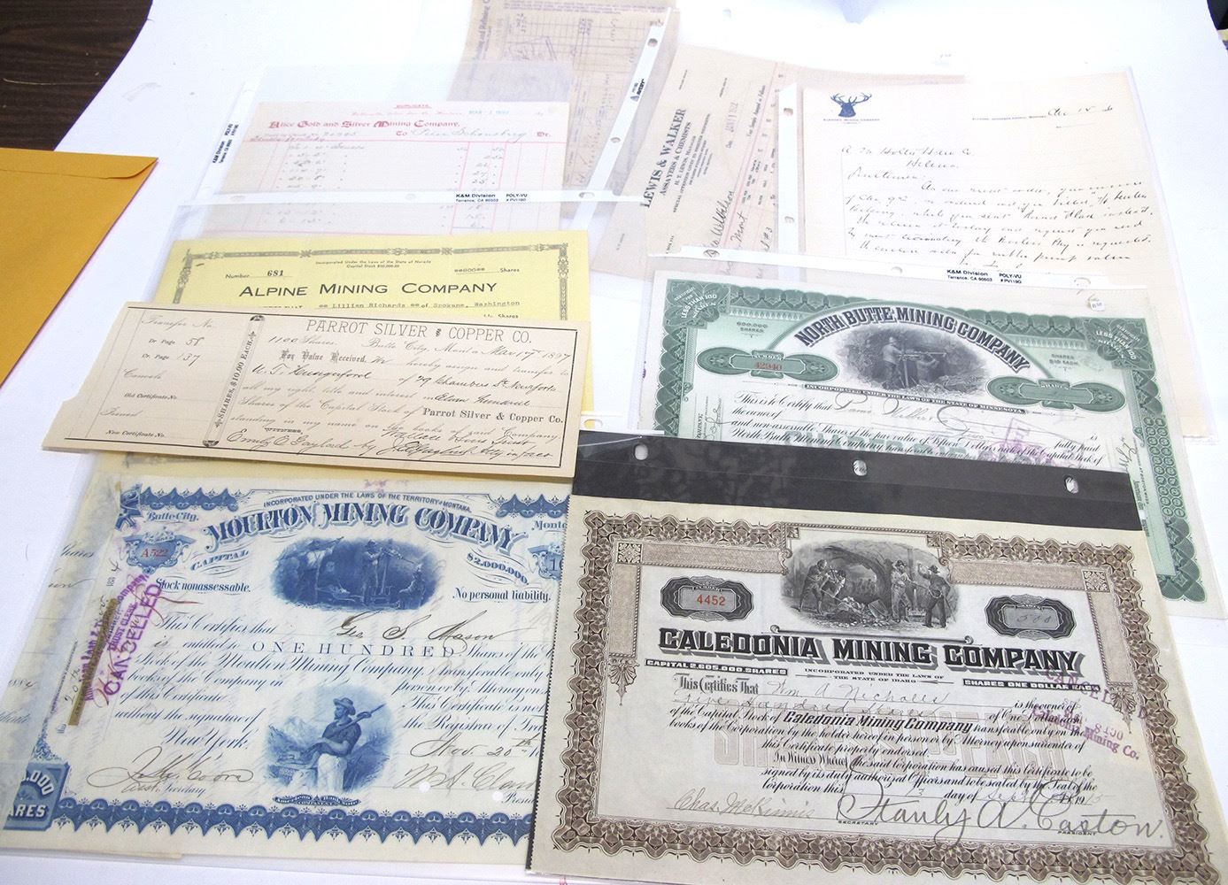 Stock issued 1884 Moulton Mining Co. signed by president W. A. Clark who competed with George Hearst. Certificates from Caledonia Mining Co., North Butte Mining Co, Alpine Mining Co.., receipts from Parrot Silver & Copper Co., Alice Gold and Silver Mining Co.American Smelting and Refining Co., Lewis & Walker Assayers, letter from Elkhorn Mining Co. 1896. Date: Location: Montana HWAC # 53765