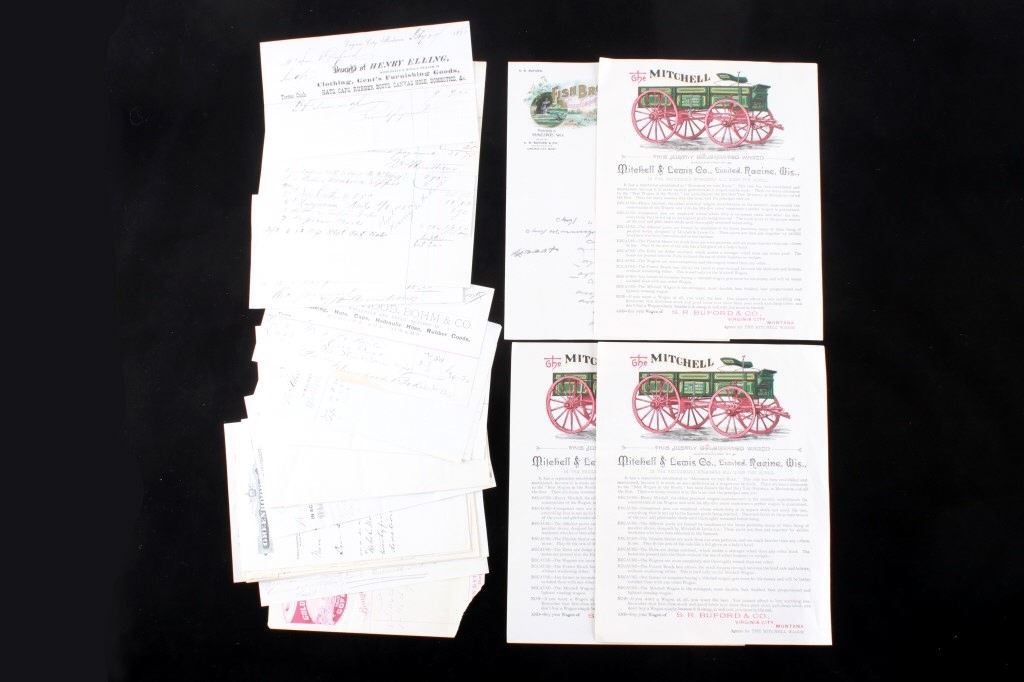 For your consideration is this collection of ephemera from Montana Territory, most prior to statehood, from 1872 to 1883. There are many items from Virginia City, Montana. These include bills: Wm. P. Armstrong Boots, Shoes and Leather Virginia City 1872, Harrington & Baker Leather and Findings Virginia City 1873, J. H. Baker Dealer in Boots and Shoes Virginia City, Montana 1879, W. P. Armstrong Clothing, Furnishing Goods, Hats and Caps Virginia City 1879, Greenhood, Bohm & Co. New York, San Francisco, Helena, Virginia City Wholesale and Retail Dealers 1879, his lot includes over 30 unique pieces the majority being from pre-statehood Montana Territory with the three oldest items being from when Virginia City was the Territorial capital, the balance from pre-statehood years. S. R. Buford was the region's largest grocery store in 1878, Alexander McKay was the earliest and most respected pioneer miner. This collection all sells together. Most items are in good condition especially considering their ages.