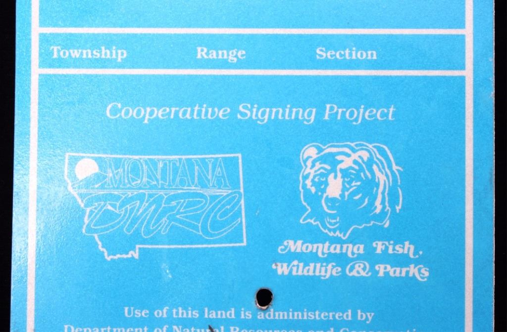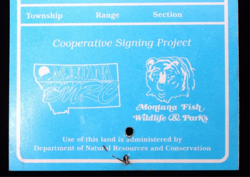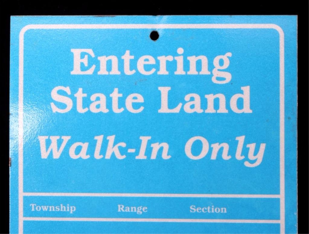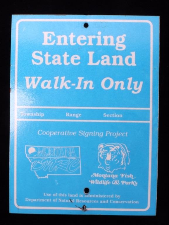 This is a Montana Fish, Wildlife & Parks Sign. The sign was used to mark the entrance to state owned land. The sign reads "Entering State Land Walk-In Only". The sign is made from aluminum. It shows good overall condition. The sign measures 5.75" x 7.75".