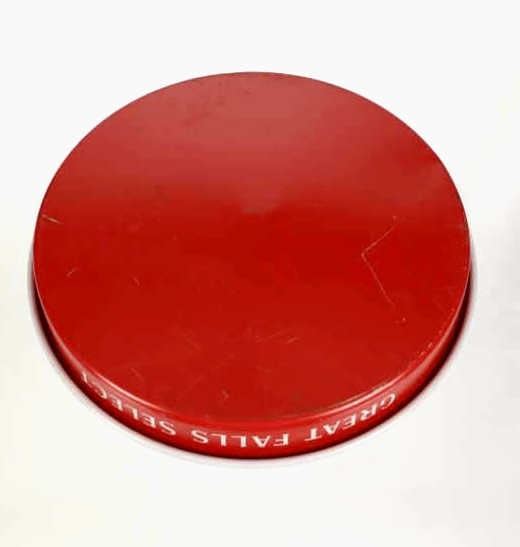 Featured in this lot is this original “Great Falls Select Fine Beer” tray from Great Falls, Montana. The tray has the red flag logo and features the gold trim on the inside edge. The tray reads "Great Falls Select" on the inside and outside edges. The tray also reads “Great Falls Select - Quality Product - Fine Beer.” The condition of this beer tray is good, with scratches and wear on the bottom and small slight scuffs on the rim but overall good condition. The tray measures 13" in diameter and 1 5/8" in height.