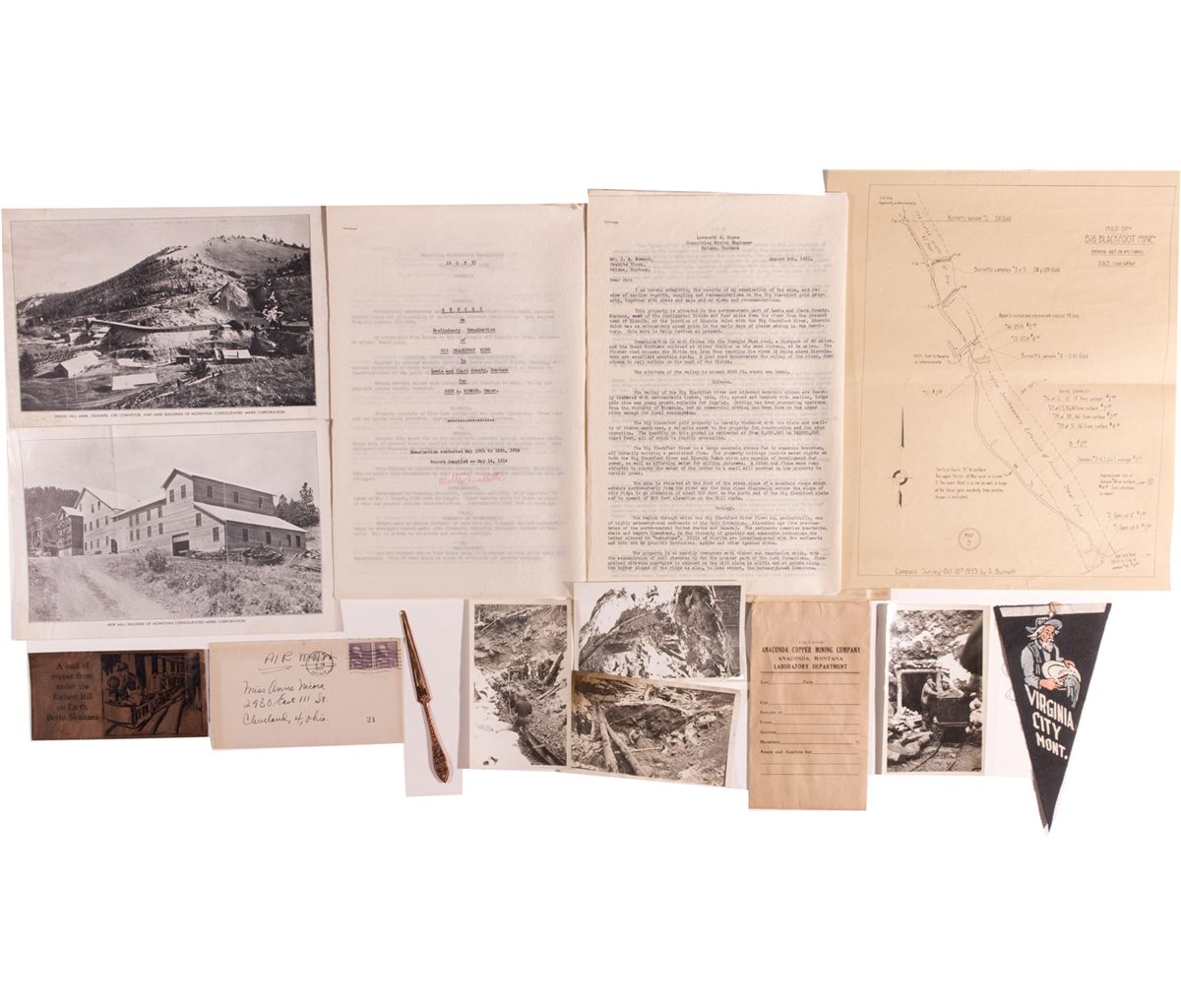Group of three Montana mining souvenirs: (1) copper letter opener, Butte, Mont.; (2) copper sheet souvenir. "A load of copper from under the Richest Hill on Earth, Butte, Montana," Includes short letter and envelope postmarked Feb. 20, 1944; (3) 7 1/2 inch pennant, Placer miner, Virginia City, Mont. A second group of four documents regarding the Big Blackfoot Mine in Lewis and Clark County, Montana: (1) Report on Preliminary Exploration (1914); (2) Letter report on the Big Blackfoot gold property (1931); (3) Summary Report of Big Blackfoot Lode Mine (1933); (4) Map of Big Blackfoot Mine, No. 1 Tunnel (1933). Third is pair of two photo plates from a prospectus for the Montana Consolidated Mines Corp. Finally, four photos from the rescue effort for gold miners at Superior, Montana. Probably 1936.