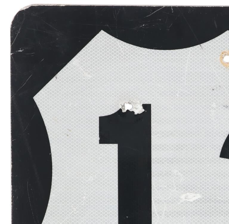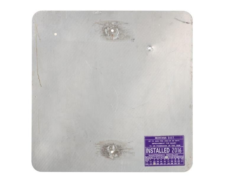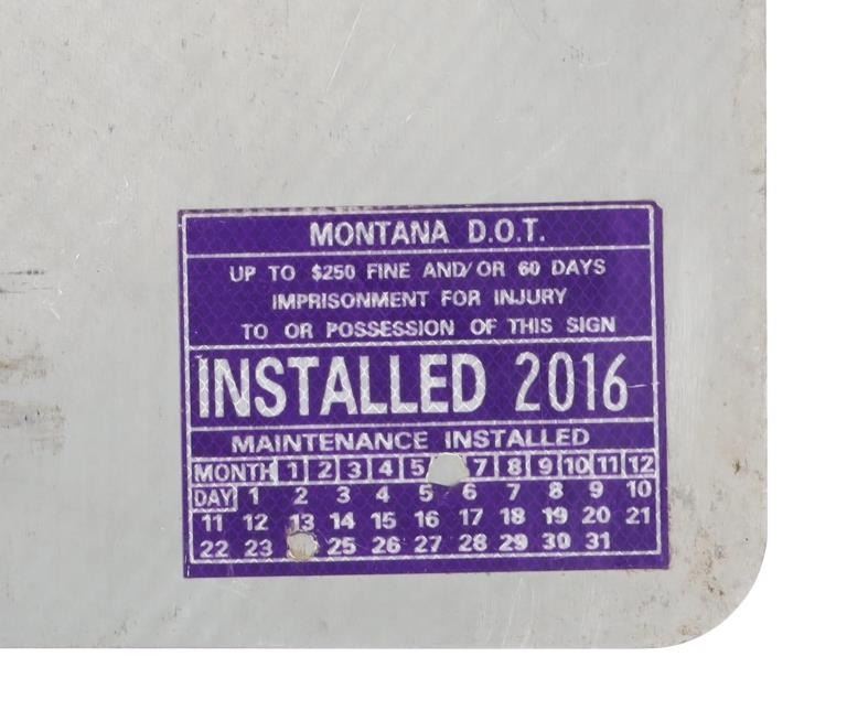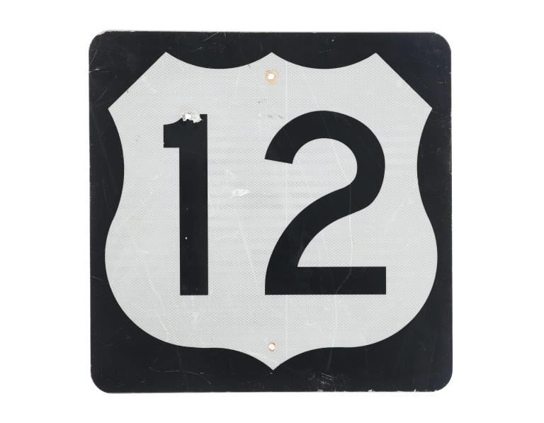 For your consideration is this original Montana Highway 12 road sign installed in 2016. U.S. Highway 12 (US 12) is an east–west United States Numbered Highway in the state of Montana. It extends approximately 597.576 miles (961.705 km) from the Idaho state line east to the North Dakota state line, the greatest distance that US 12 traverses through any state. The sign shows a shield style graphic in the center with the number 12 in bold, black lettering. The white section on the sign is reflective. A blue sticker on the back of the sign tells when the sign was installed. The sign shows good condition overall with wear present from its life outdoors. One bullet hole is present. The sign measures 24" L x 24" W and weighs 4 pounds and 8 ounces.
