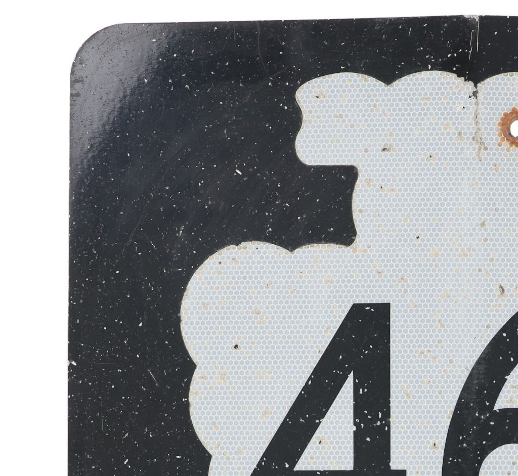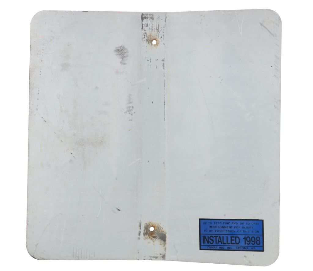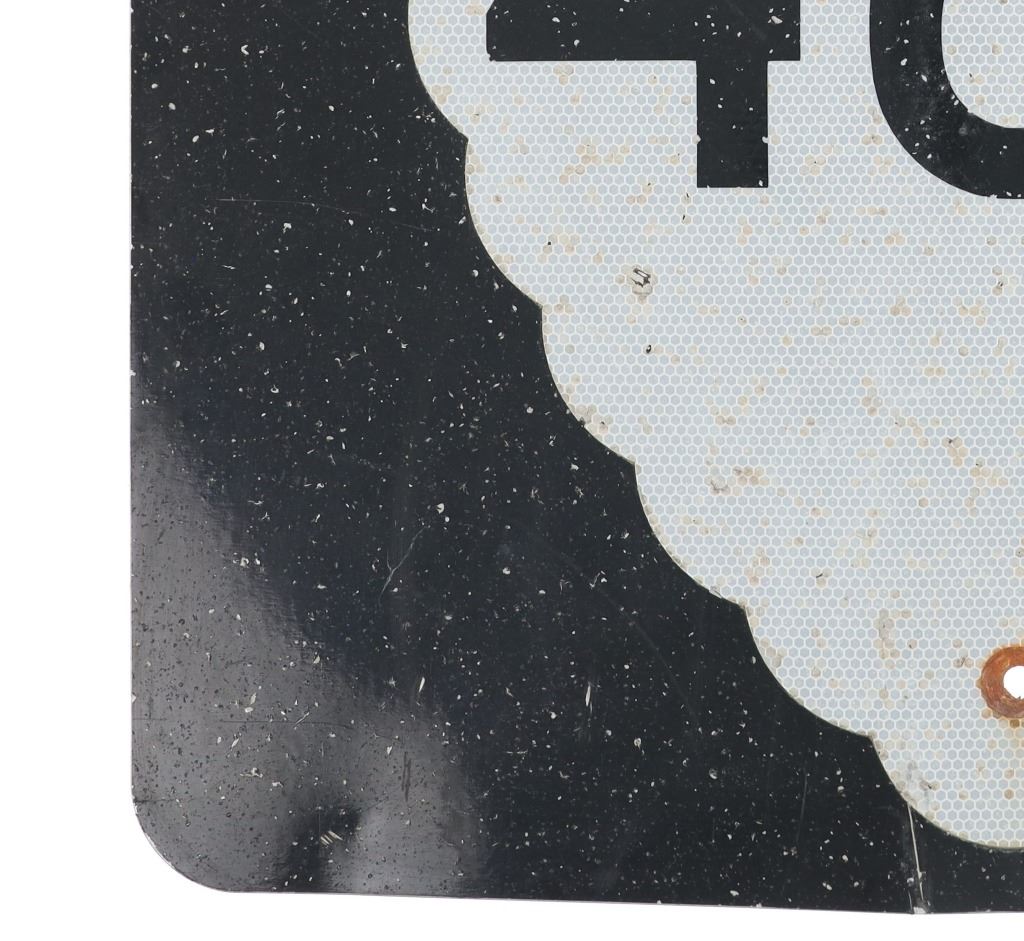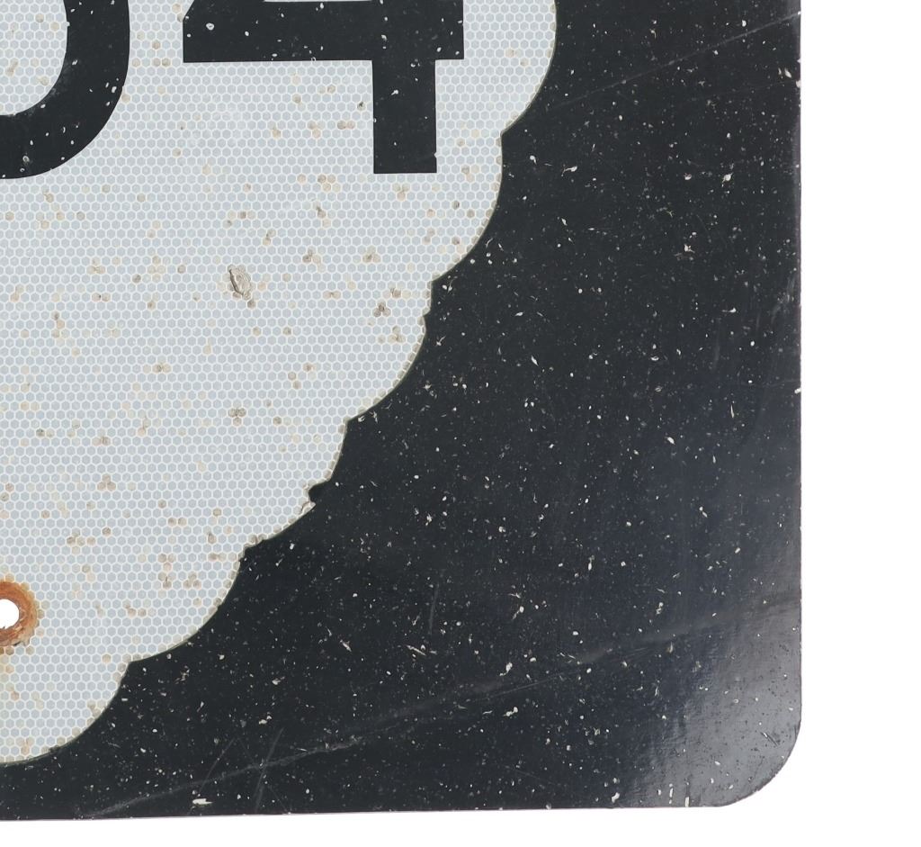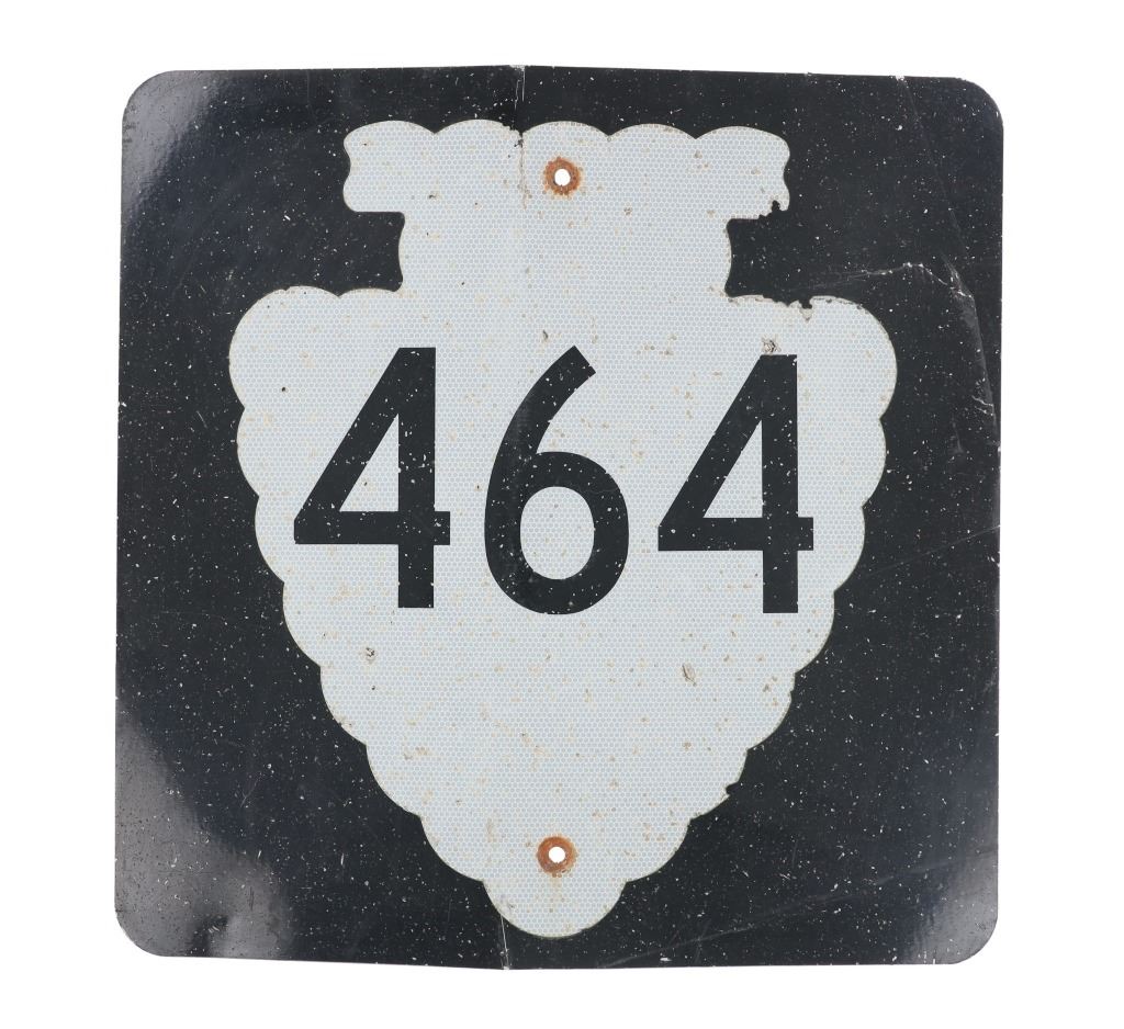 Featured in this lot is this Montana Highway 464 large reflective road sign. Montana Highway 464 is a secondary highway stemming from US 2 and US 89 in Browning and in Babb and was created in 1957 and is the secondary Highway to take to Duck Lake. The sign shows a downward facing arrowhead of off white honey comb pattern reflective coloration with black lettering and a black field behind it. The sign reads as follows: 464. The condition of this Montana highway sign is fair with a vertical bend int he sign with some oxidation and chips to the paint but otherwise shows a fair overall condition. The measurements of this sign is 24" x 24".