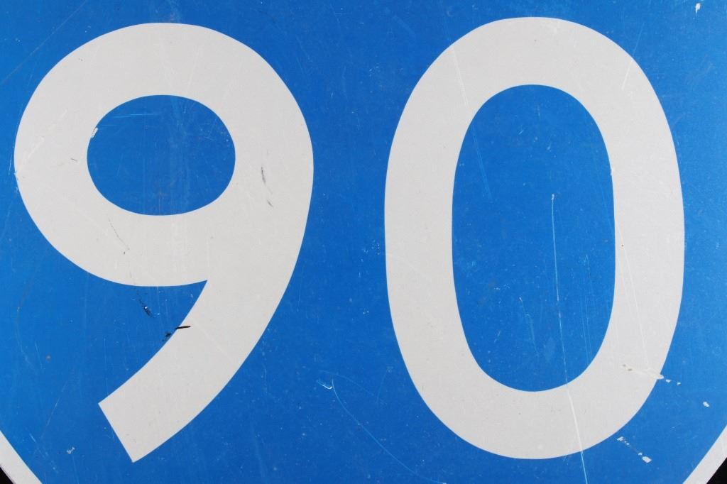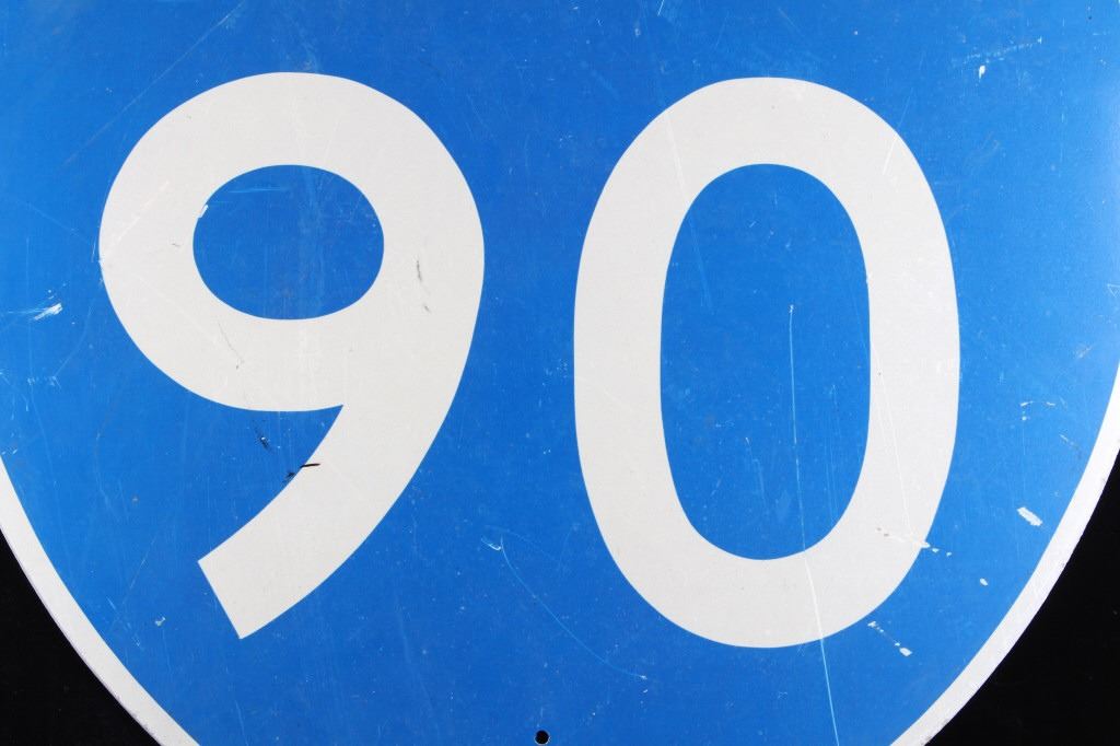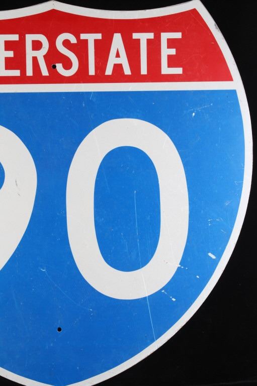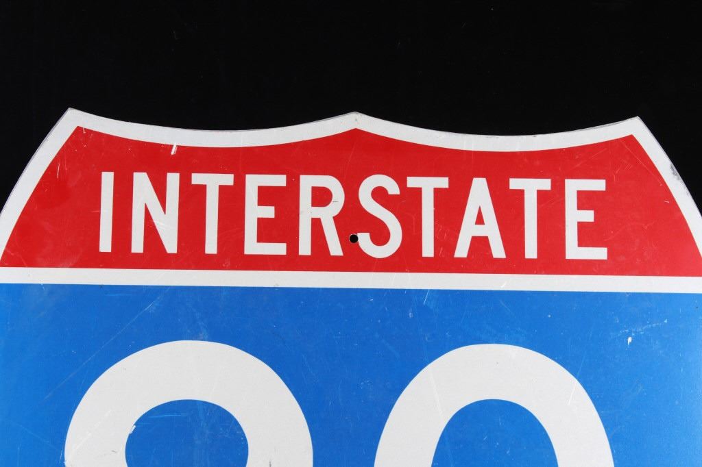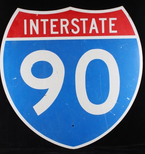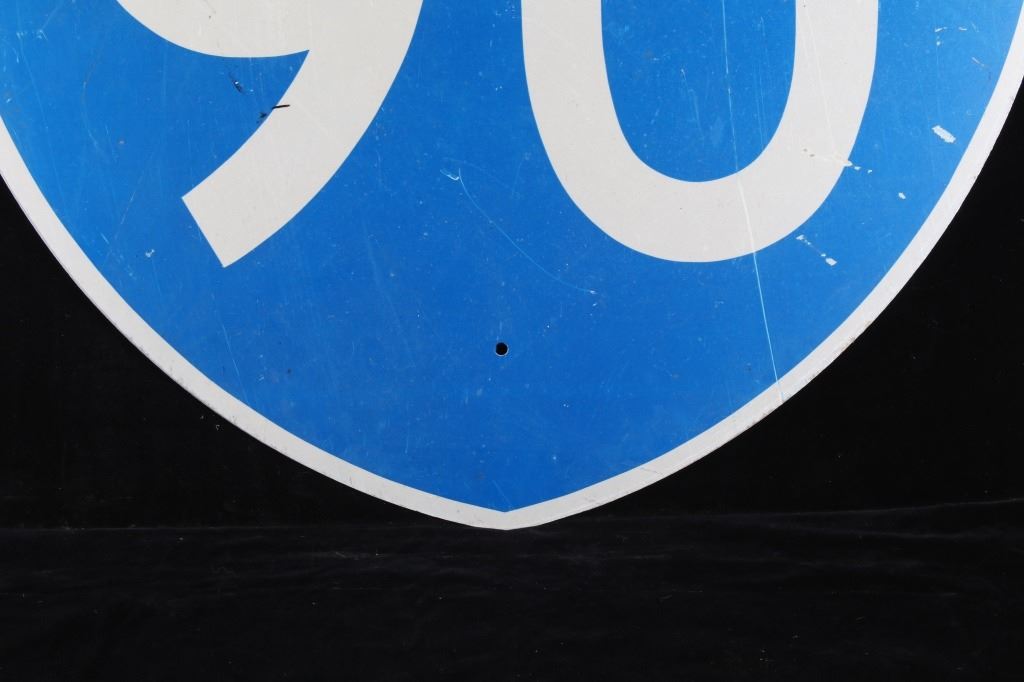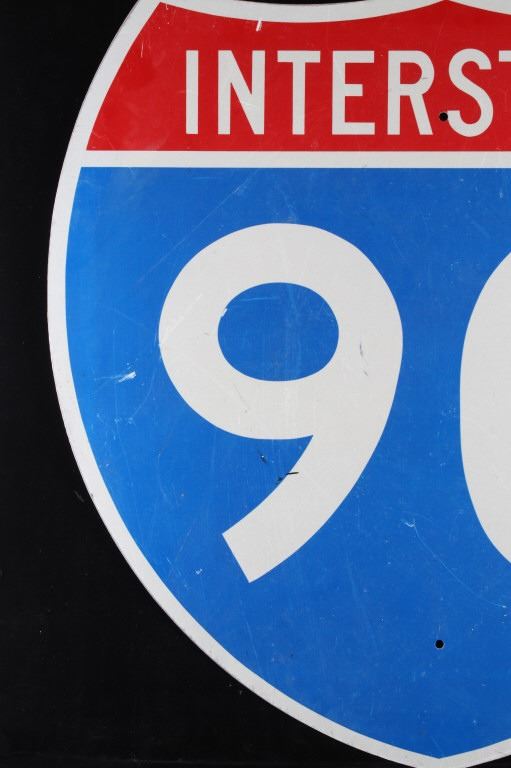 Included in this lot is a large, original Montana Interstate 90 highway sign. This sign displays the classic interstate sign in the shape of a shield with the red and blue colors. The sign features modern reflective graphics. The sign is in overall good condition, with slight wear to the sign due to age and use. The back of the sign has two pieces of wood screwed across the top and bottom. The sign measures 36" by 36".