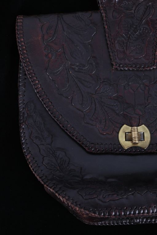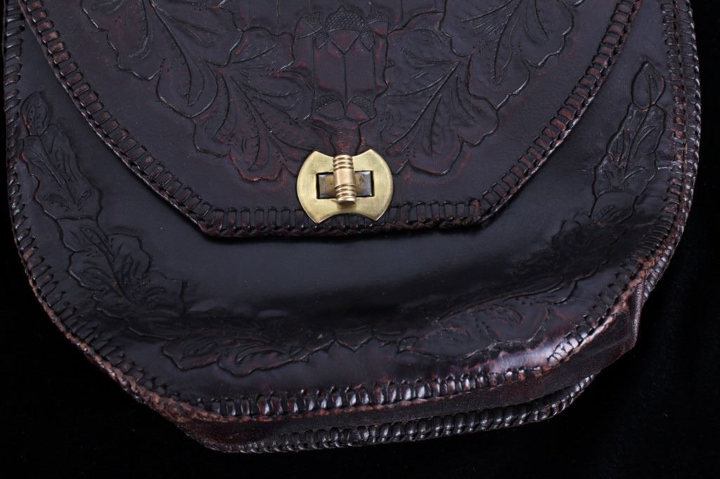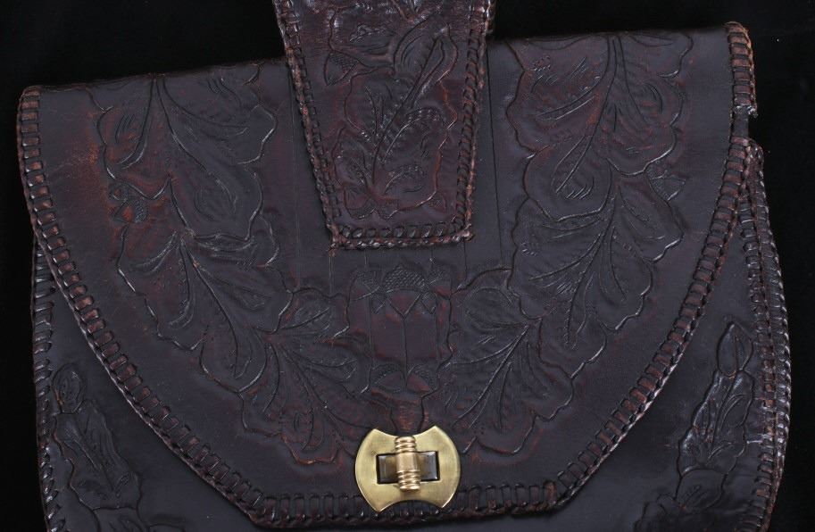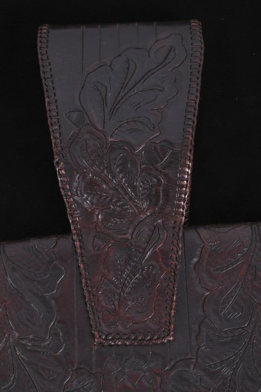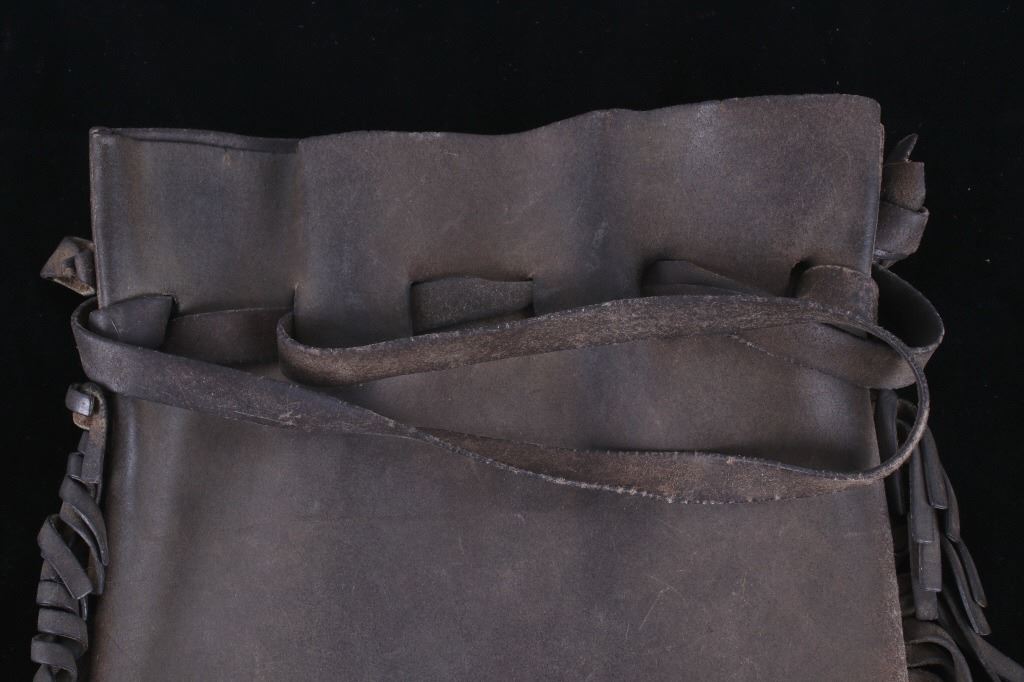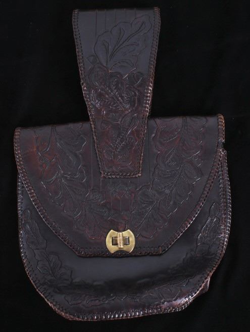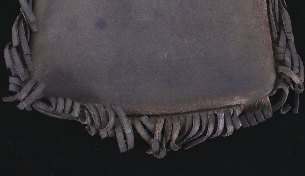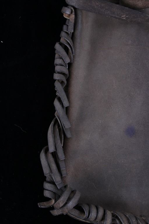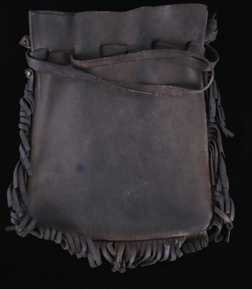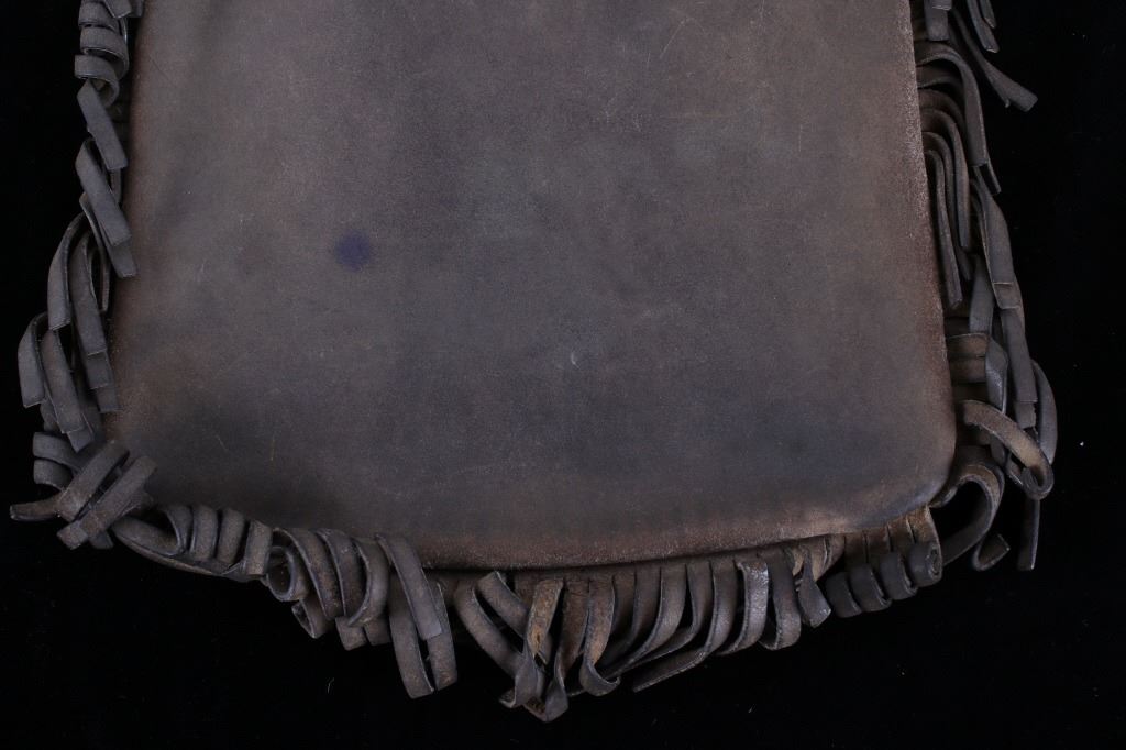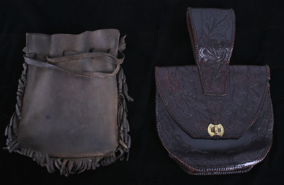 Featured in this lot is this Montana leather accessory bag collection, circa 1960's. There are two bags in this collection. The first is a tooled western style accessory bag, presumably for a belt on a pack strap, and shows a large inner cavity with two smaller pockets. The second bag is constructed from thick hide with a fringe featured around the bag and shows an adjustable leather waist band for the bag. The condition of these leather bags is good, with no obvious signs of damage. The measurements of this pair of leather bags are 15 1/2" x 10 1/2" x 2 3/4" and 13 1/2" x 10 1/2".