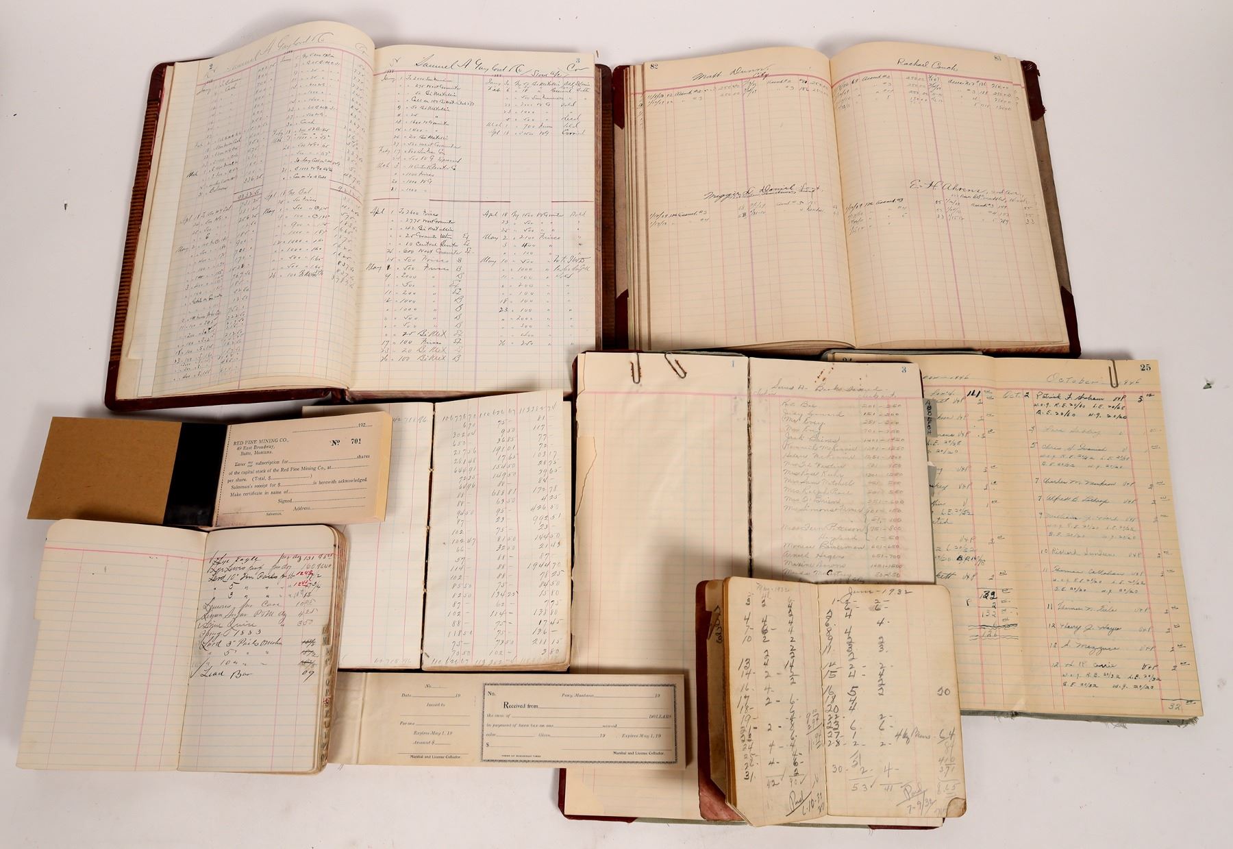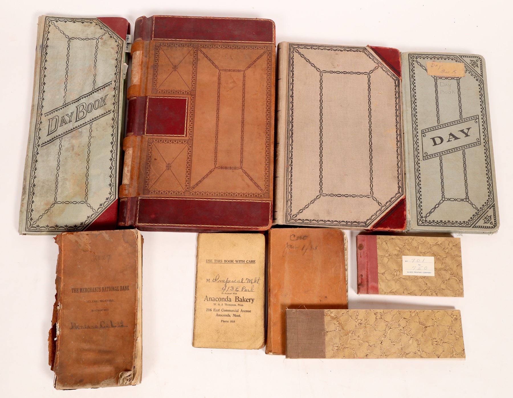 9 assorted Montana ledgers and others. Anaconda Bakery. 1883 gas, food and groceries. Pony. 1946.1905-11. Nice leather bound. Helena. Red Pine Mining Montana c. 1893-1946
