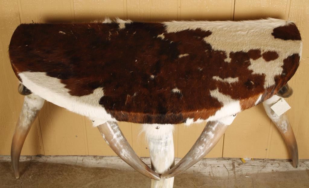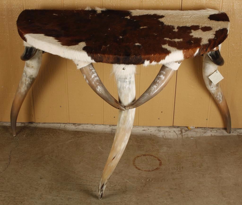With three horn legs, table top covered in brindle cow hide and accented with several smaller horns.