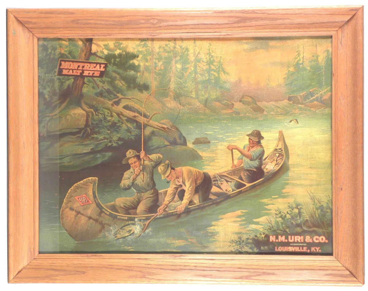 Montana Malt Rye Cardboard Sign. N.M. Uri & Co. Louisville, KY. Depicts fishing scene. A couple of small bubbles otherwise very good condition. 24 X 18 inches.