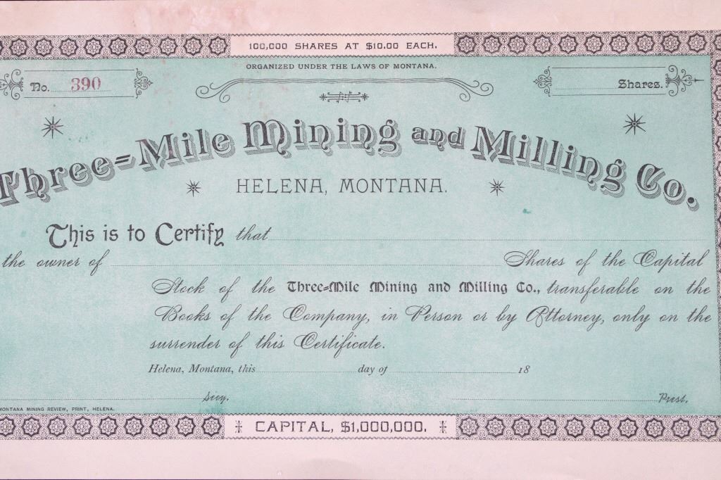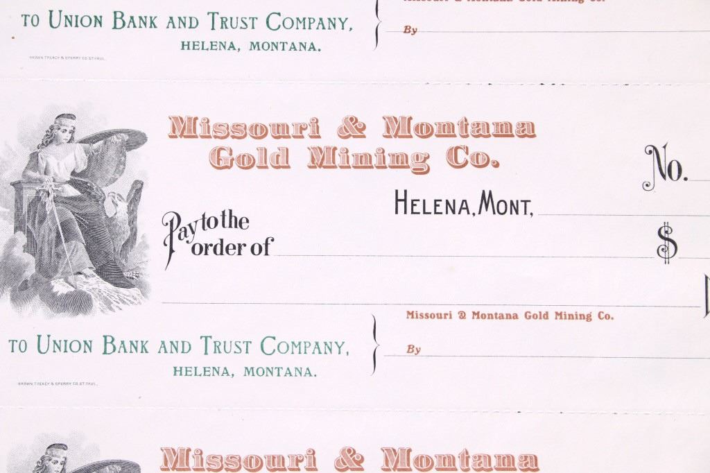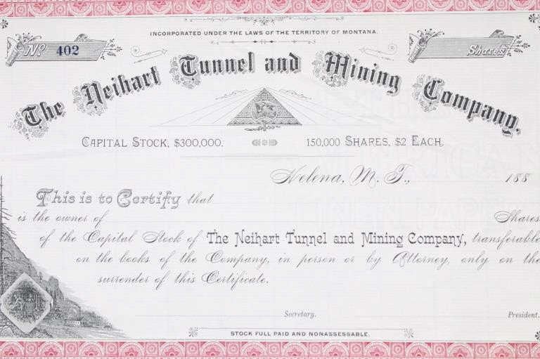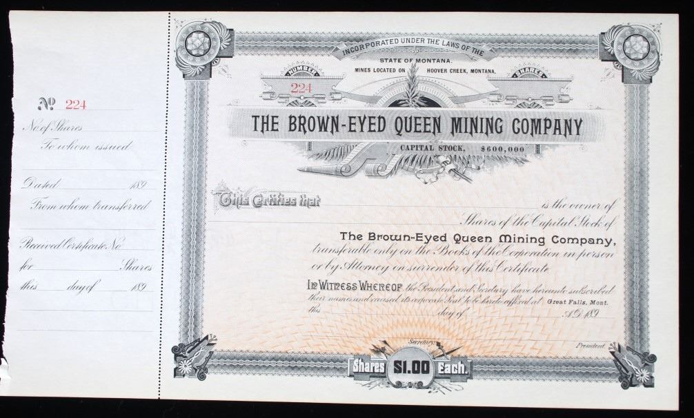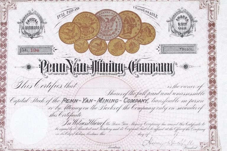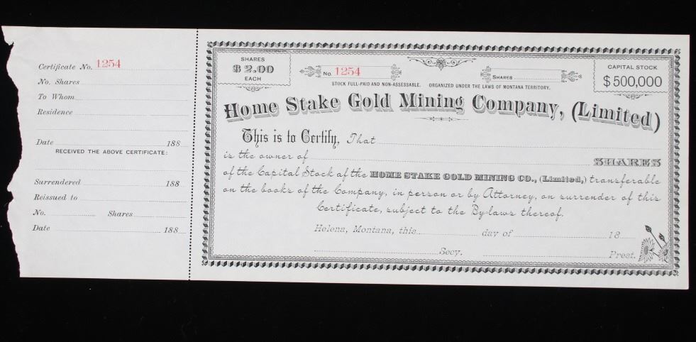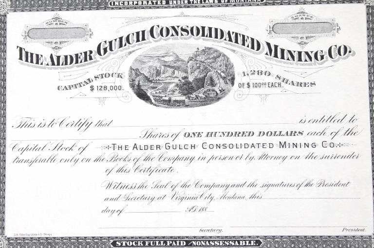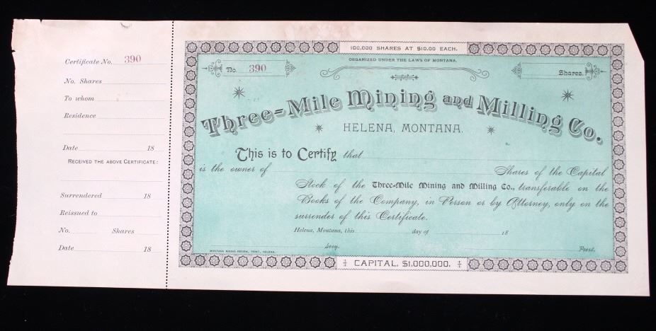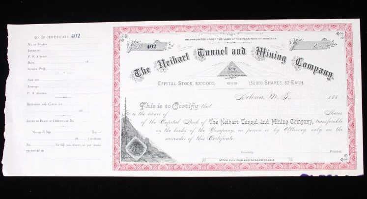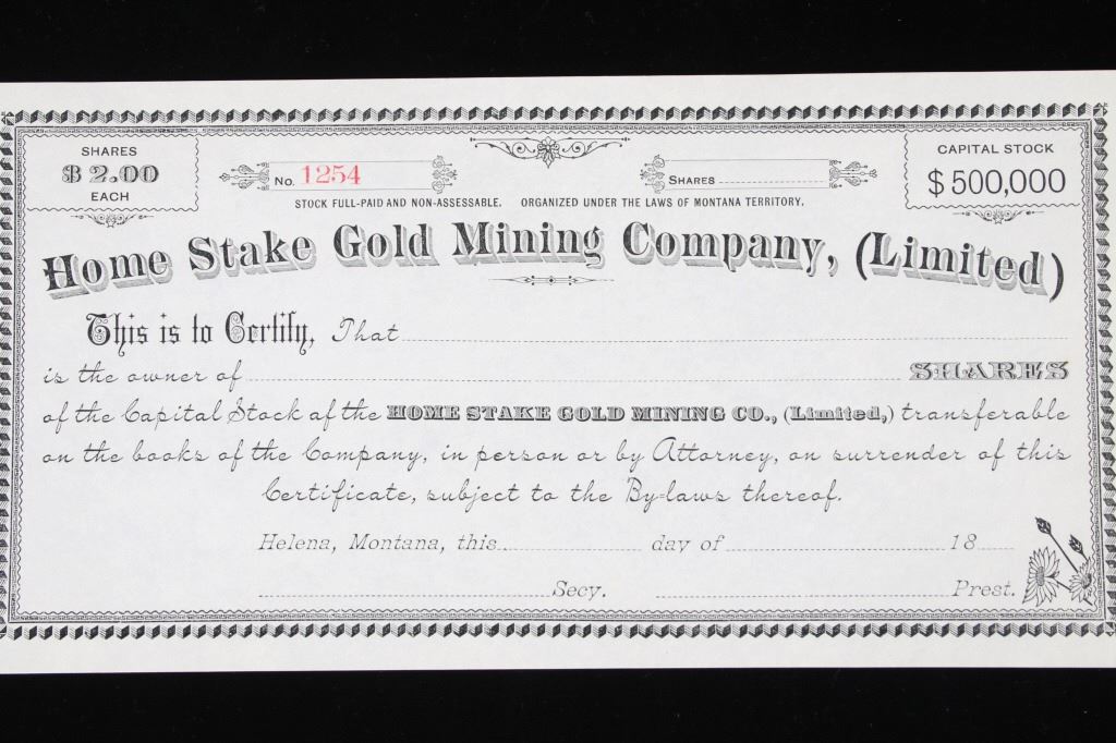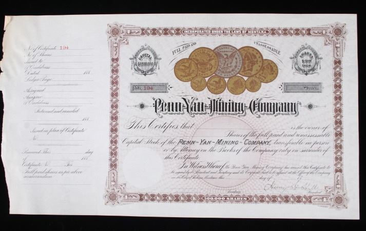 For your consideration is this collection of vintage and unissued stock certificates from seven (7) different Montana mining companies: New Copper-Silver Company, The Alder Gulch Consolidated Mining Company, The Brown-Eyed Queen Mining Company, Three-Mile Mining and Milling Co., The Neihart Tunnel and Mining Company, Home Stake Gold Mining Company, (Limited), and Penn Yan Mining Company, and three blank checks from the Missouri & Montana Gold Mining Co. Helena, Mont. The Penn Yan Mining Company is notable for having produced approximately $50.000,000 in gold and silver before operations ceased in the early 1890, certificate has a Vignette that contains the reverse and obverse of US Coins, dating from 1873 to 1880. A stock certificate is a physical piece of paper that represents a shareholder's ownership in a company. Stock certificates include information such as the number of shares owned, the date of purchase, an identification number, usually a corporate seal, and signatures. The certificates are most often a bit bigger than a normal piece of paper, and most of them have intricate designs to discourage fraudulent replication and counterfeiting, which was a problem for much of the pre-internet history of investing in corporate stocks. Before electronic record-keeping was available, stock certificates were a unique piece of work in their own right. It was fairly common to receive a stock certificate adorned with fancy designs and ornate engravings, which were like artwork in and of themselves.