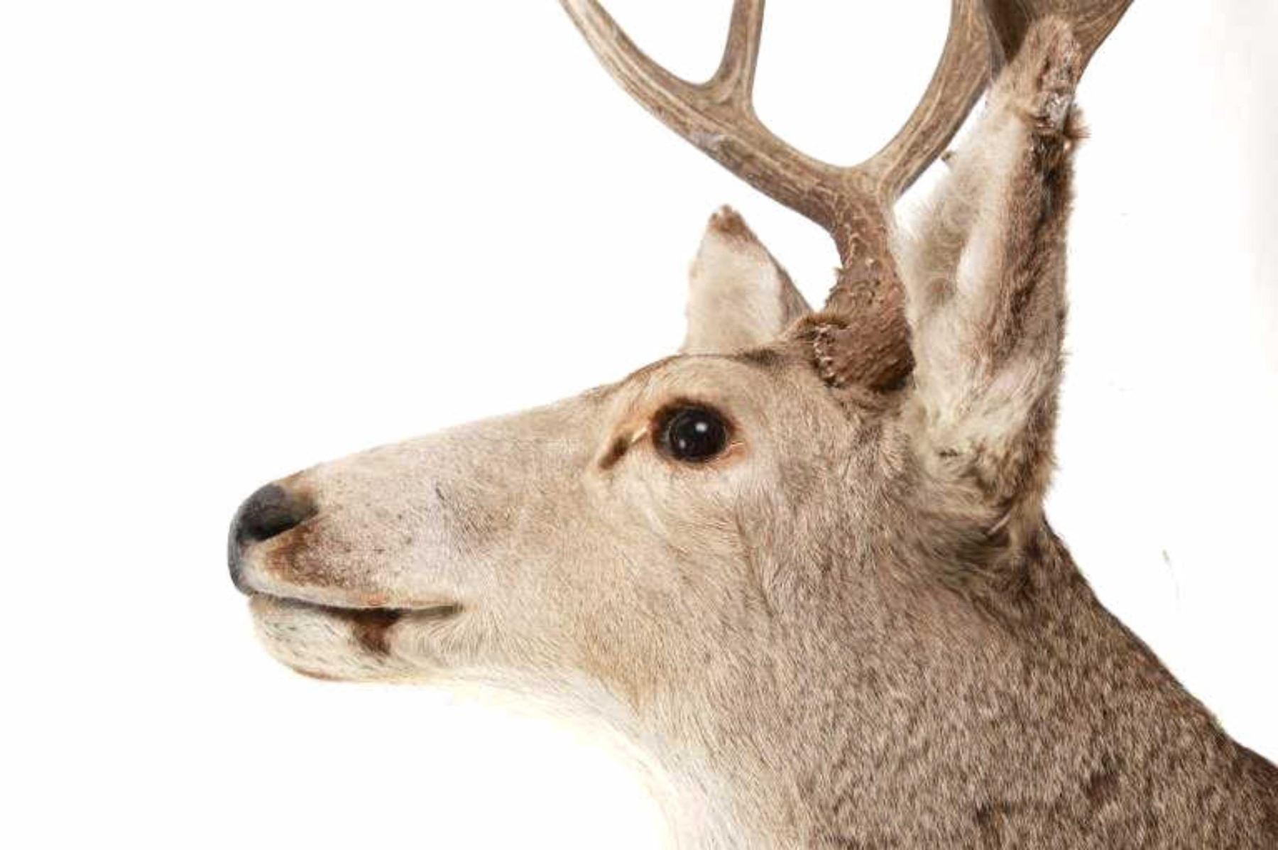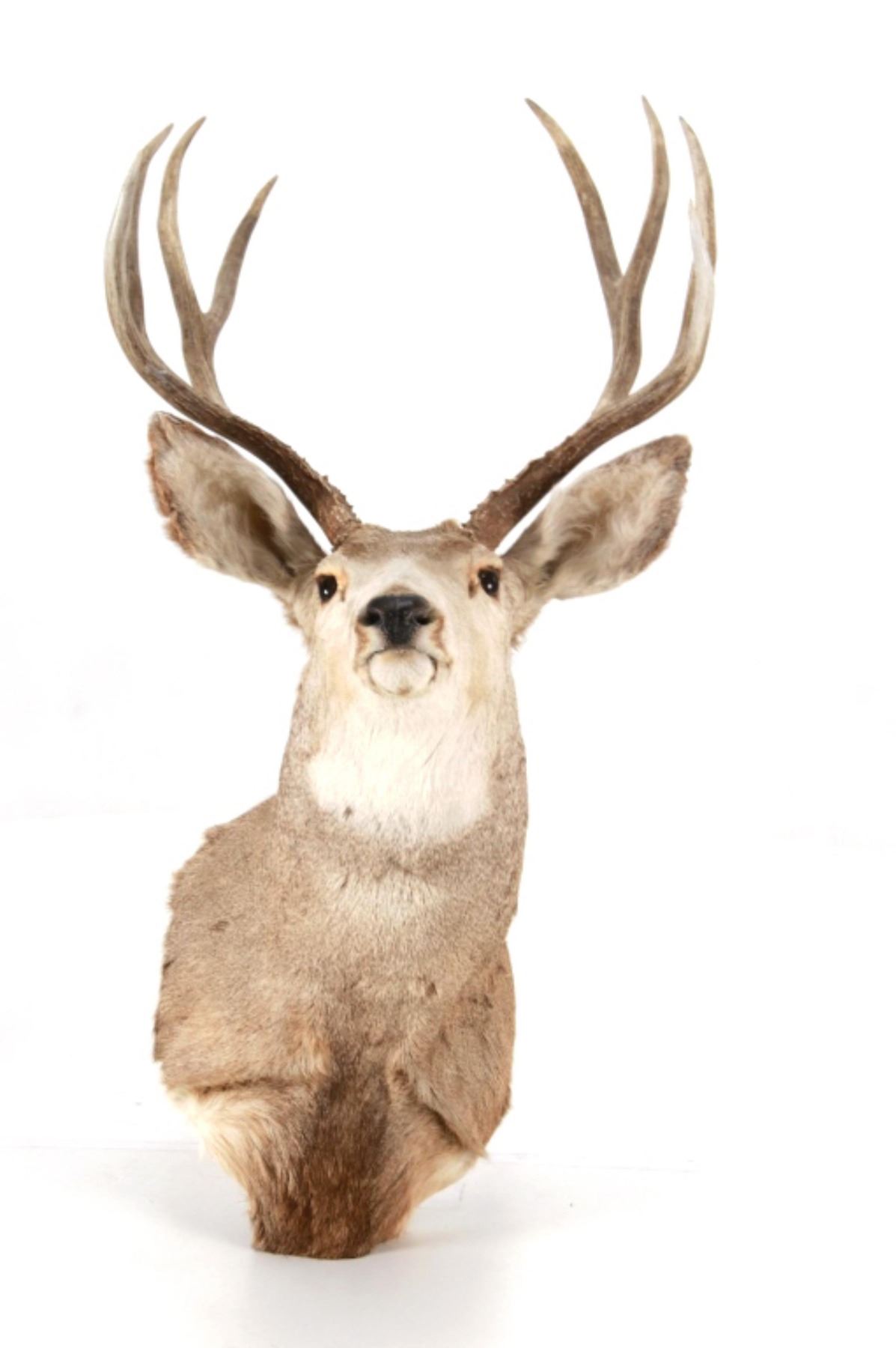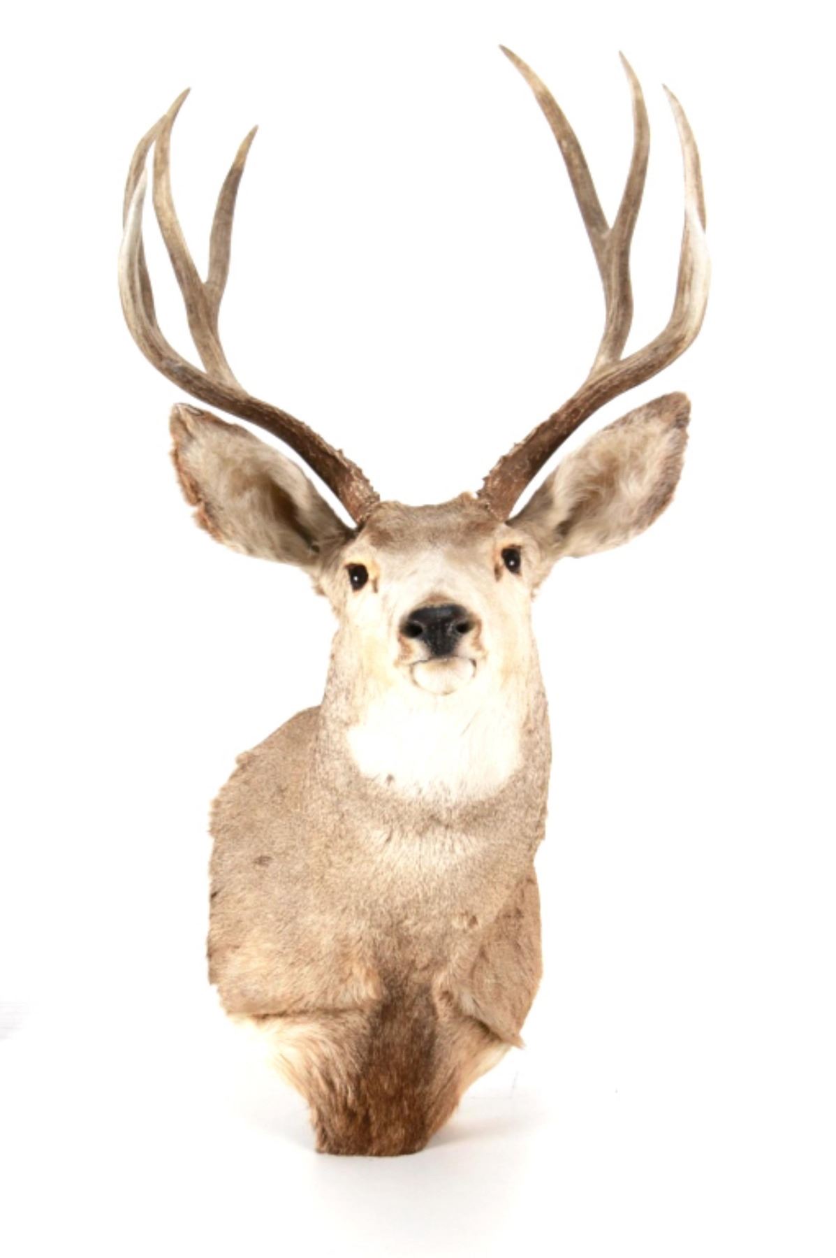 Featured in this lot is this 4x4 Montana Mule Deer Taxidermy Shoulder Mount. The deer shows a large set of 4x4 antlers . The deer shows an excellent show of color on the rack and pristine color gradient. This deer shows soft, off-white face, fading to dark brown at the bottom of the neck. Mule deer was taken in Montana by the consignors father. The condition of this Montana mule deer is well preserved with no obvious signs of damage and shows a well preserved overall condition. The overall measurements of this mount is 29 1/2" x 21" x 27 1/2". The collective weight of this mount is 12lb. The following is the Boone and Crockett - Non-Typical Mule Deer (found online and scored using this method):