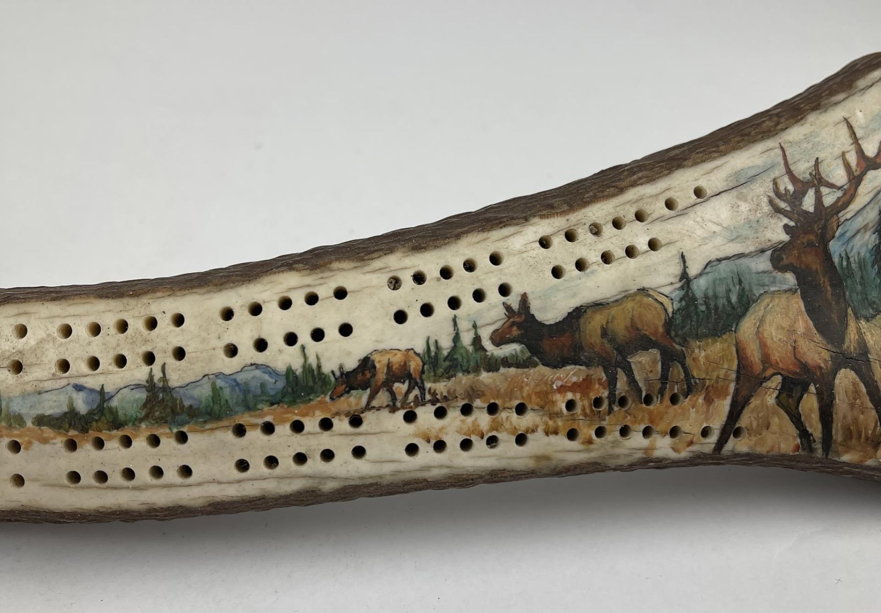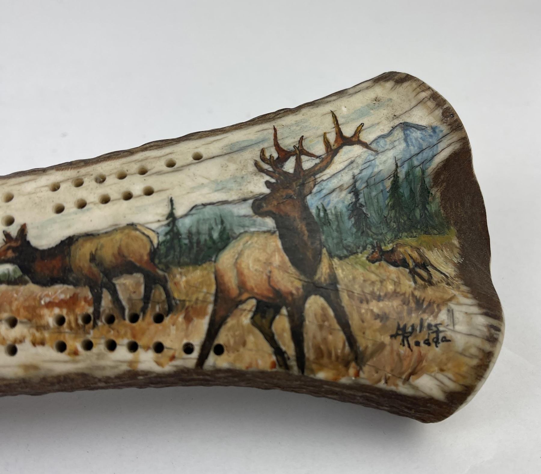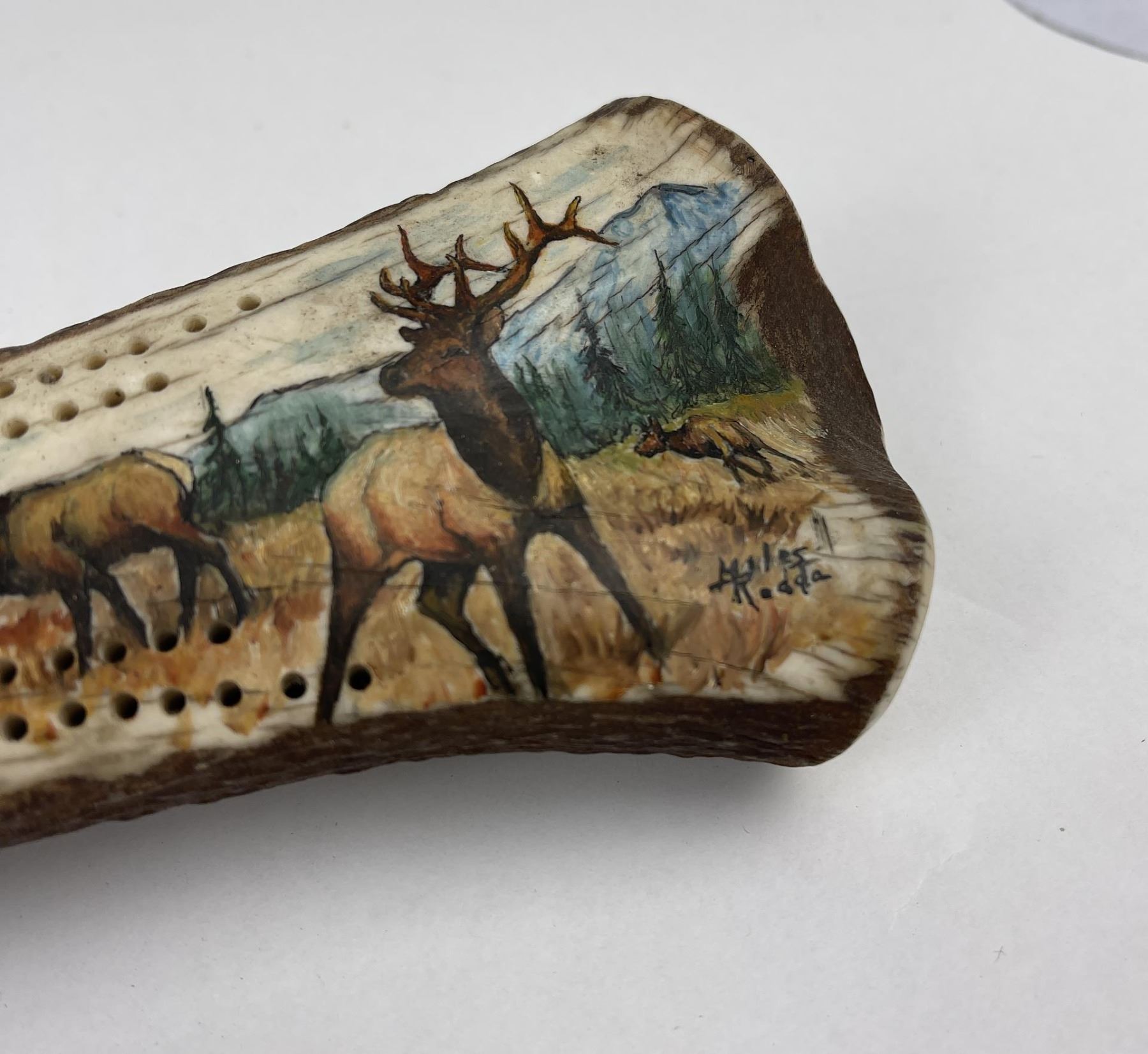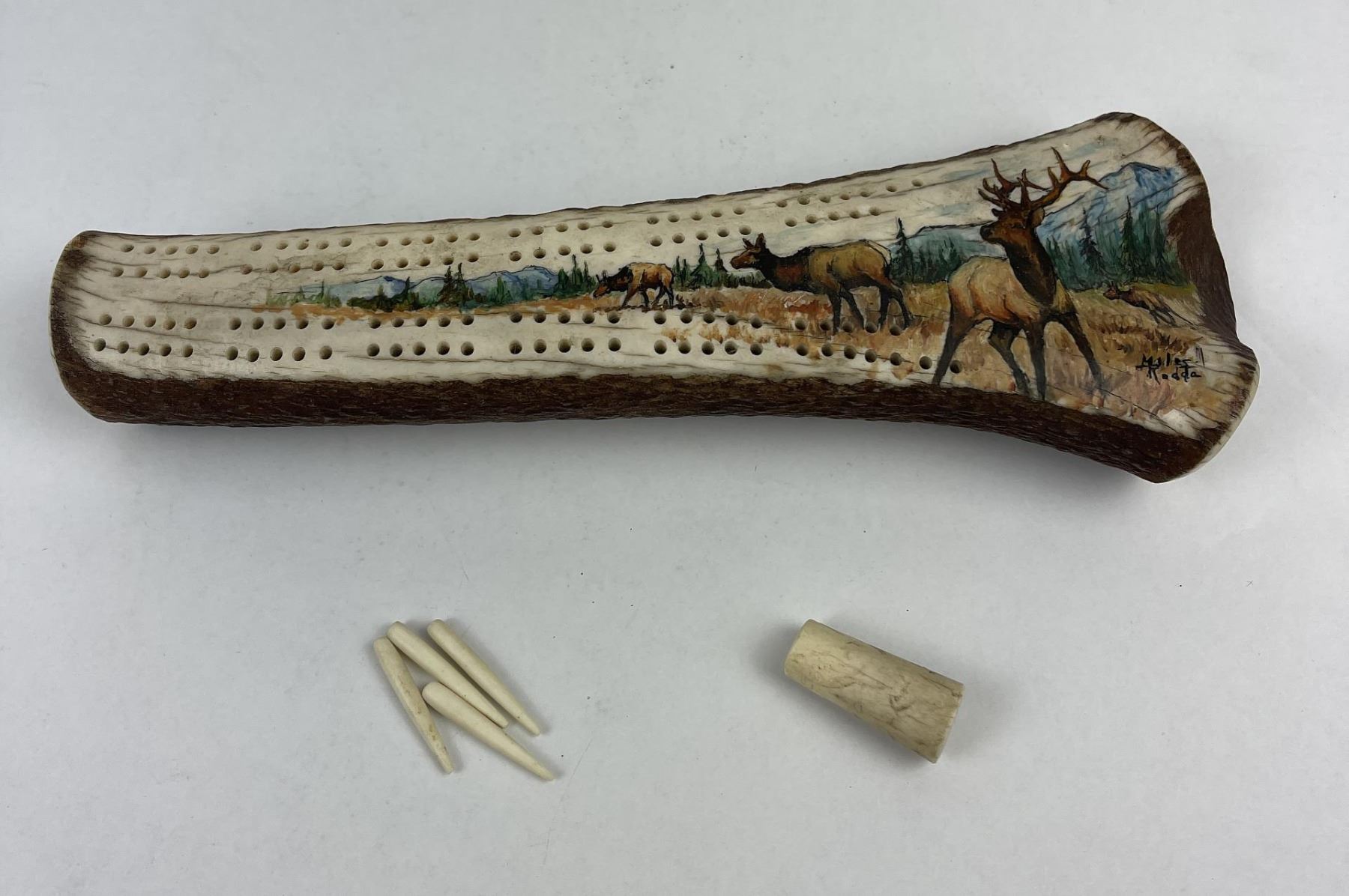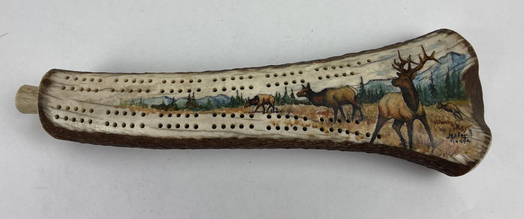 Nicely constructed cribbage board made of Montana Elk Horn. Painted and signed as shown. 11" long including peg stop.