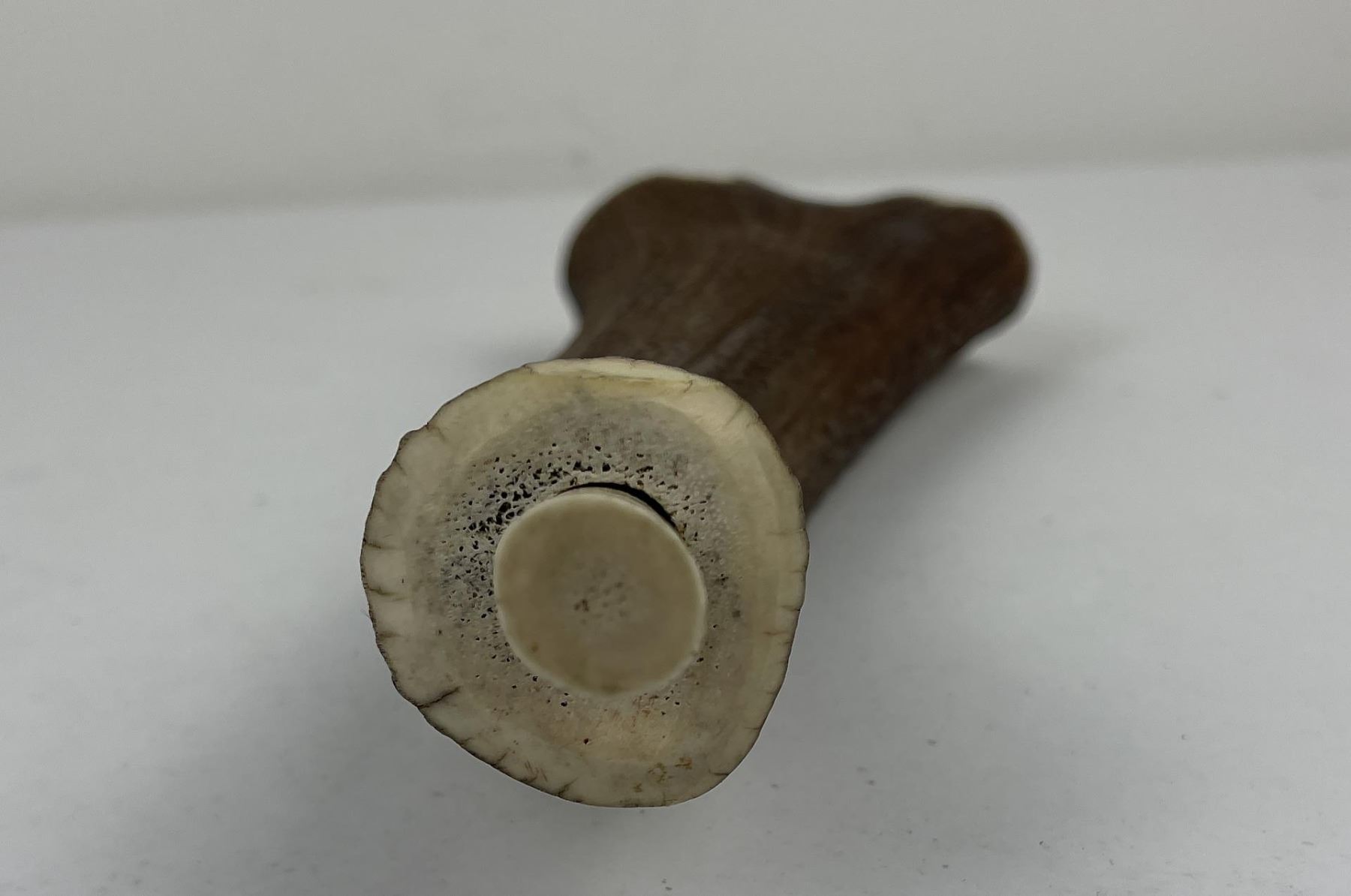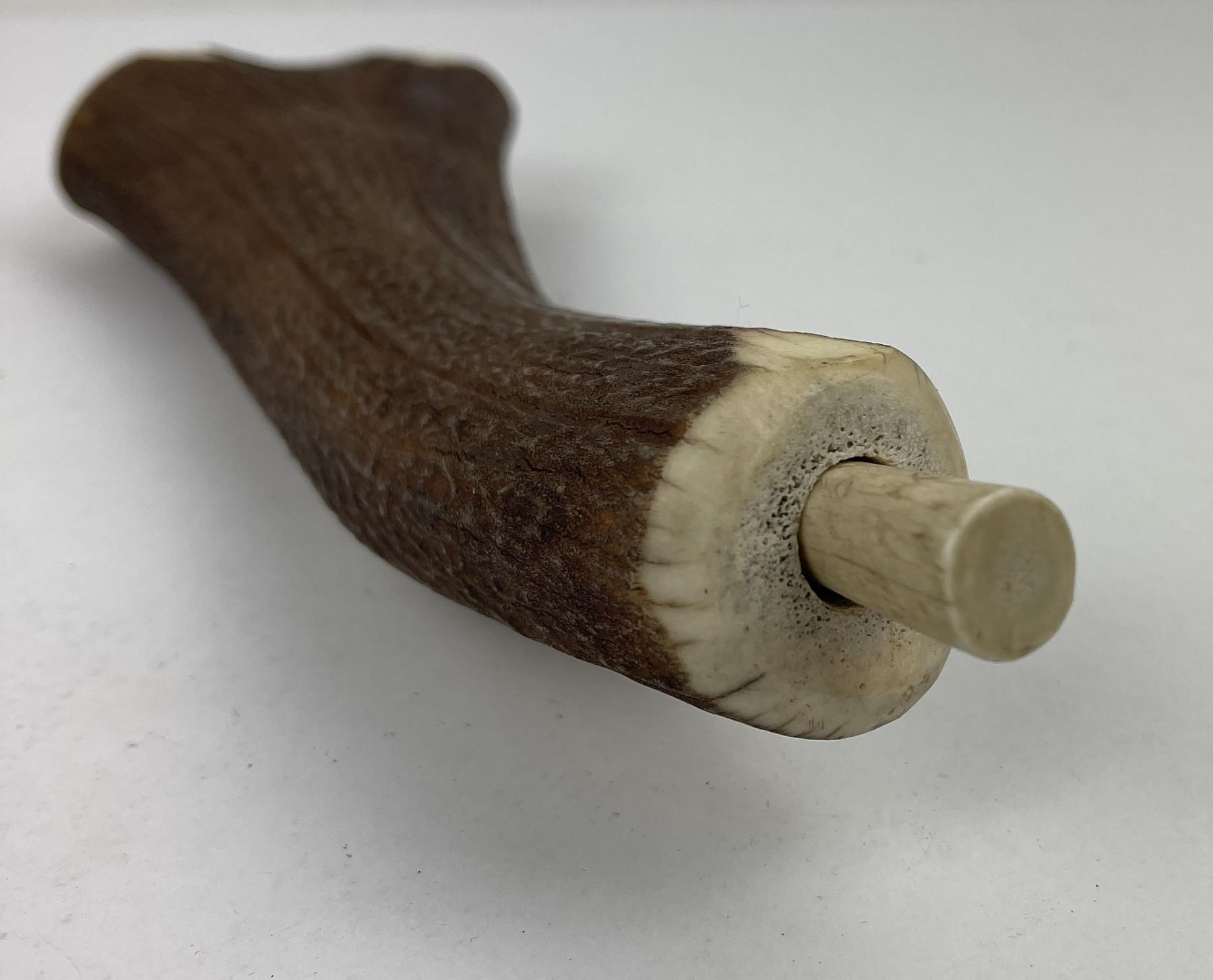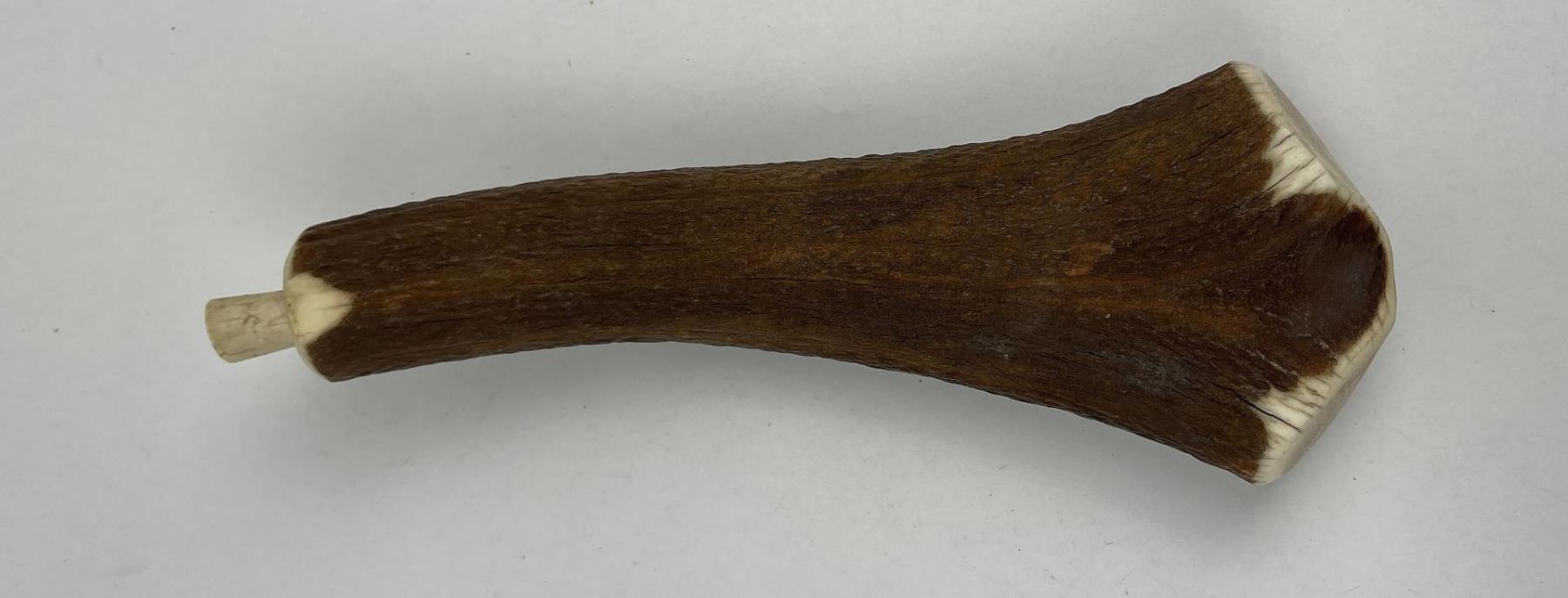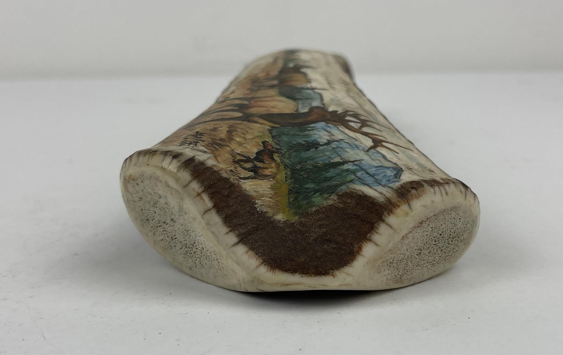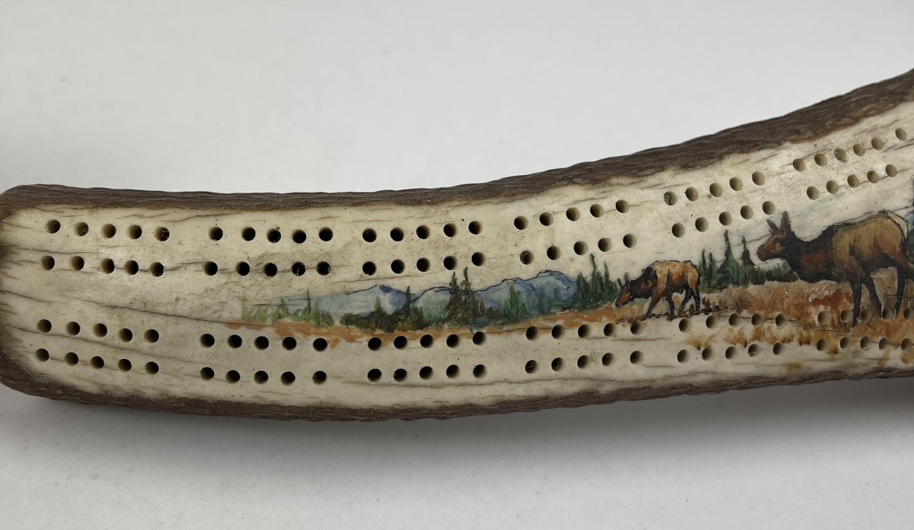 Nicely constructed cribbage board made of Montana Elk Horn. Painted and signed as shown. 11" long including peg stop.